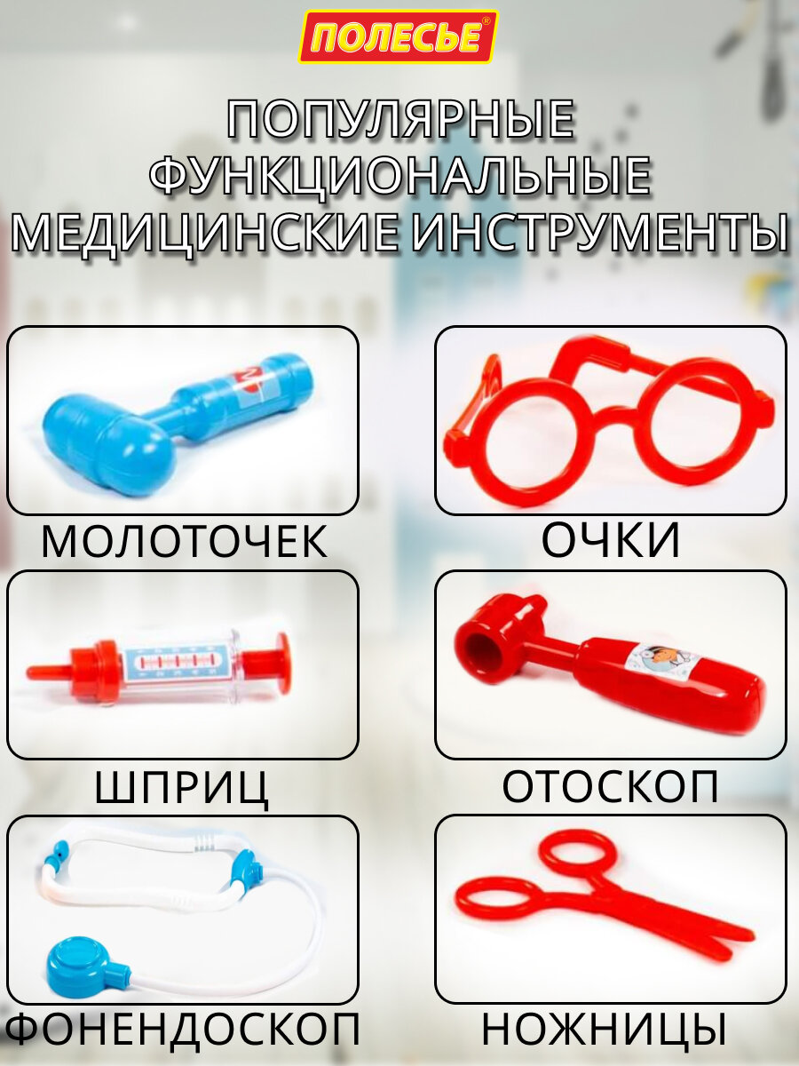 | Комплектация | ножницы - 1 шт., очки - 1 шт., лупа - 1 шт., шприц - 1 шт., лоток для инструментов - 1 шт., ложечка - 1 шт., стетоскоп (для прослушивания сердца и лёгких) - 1 шт., тонометр (для измерения давления) - 1 шт., отоскоп (инструмент лор-врача) - 1 шт., молоточек - 1 шт., мерный стаканчик с крышкой - 1 шт., стаканчик - 1 шт., баночка - 2 шт. |