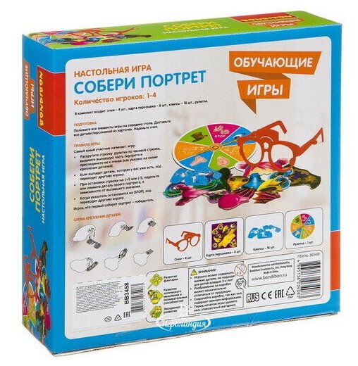 В комплекте 4 пары очков, к которым крепятся детали портрета, игровой барабан, карта персонажа - 8 шт., клипсы - 8 шт., детали портрета.