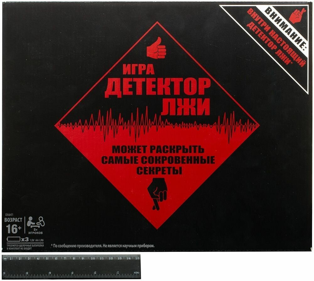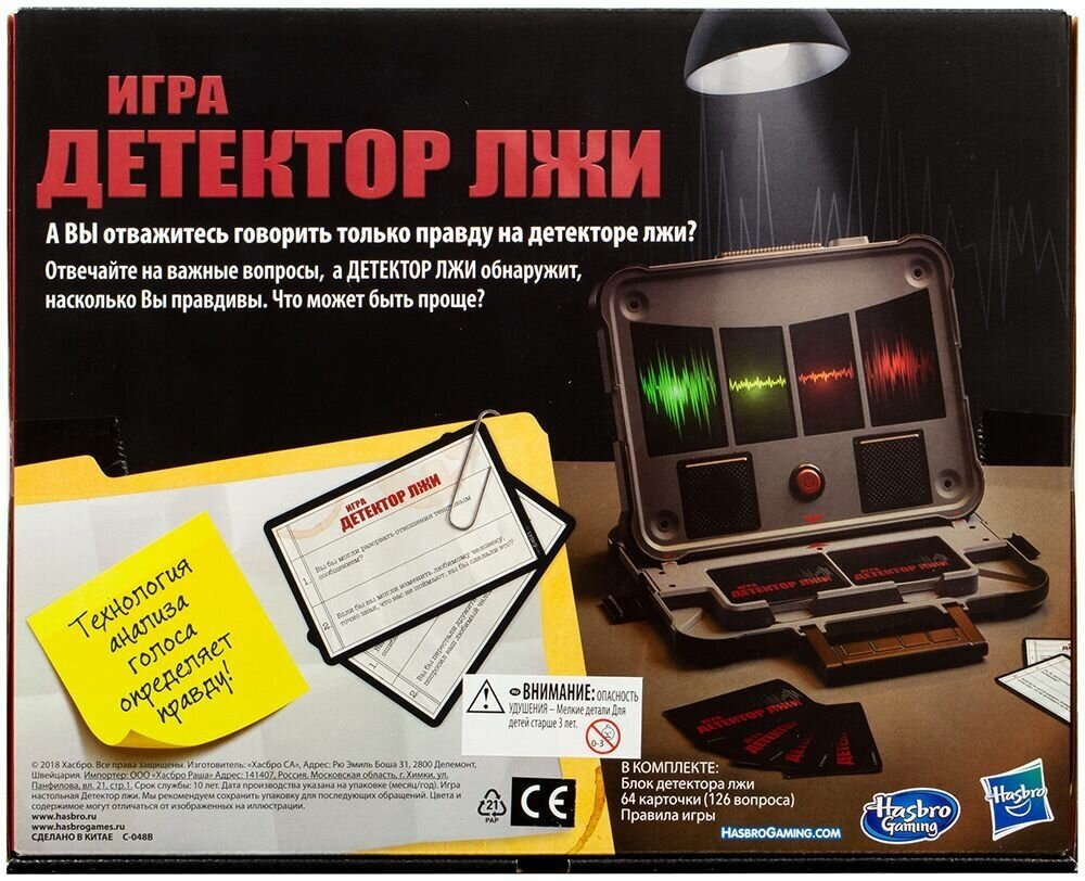 Hasbro Игра настольная Тайное становится явным абсолютно смешная и может шокировать вас, когда вы узнаете правду. Анализ голоса в этой игре для взрослых предназначен для распознавания хитрости в голосе человека и помощи в определении кто говорит правду, а кто лжет. Игроку задаются неприятные вопросы, на которые можно ответить только Да или Нет, например, Если вы узнаете, что ваш друг совершил ужасное преступление, сдадите ли вы его?. Составьте свои провокационные вопросы с ответом Да или Нет. За каждый правдивый ответ вы получаете баллы, но если солжете, очко перейдет вашему оппоненту. После того как все побывают на электрическом стуле, игрок с наибольшим количеством баллов выигрывает. Особенности: Игра детектор лжи основана на реальном устройстве Световые и звуковые эффекты помогают определить, говорите вы правду или ложь Используйте 252 каверзных вопроса из комплекта или придумайте собственные вопросы. В комплекте: Прибор детектор лжи 64 карточки (252 вопроса) Инструкции.