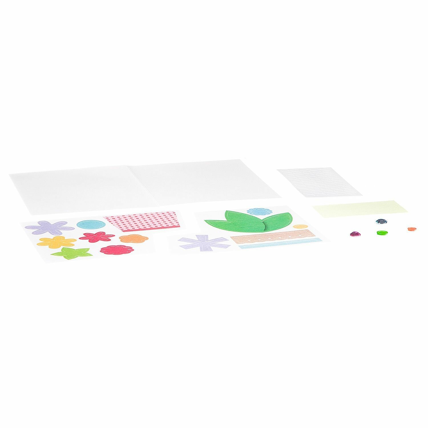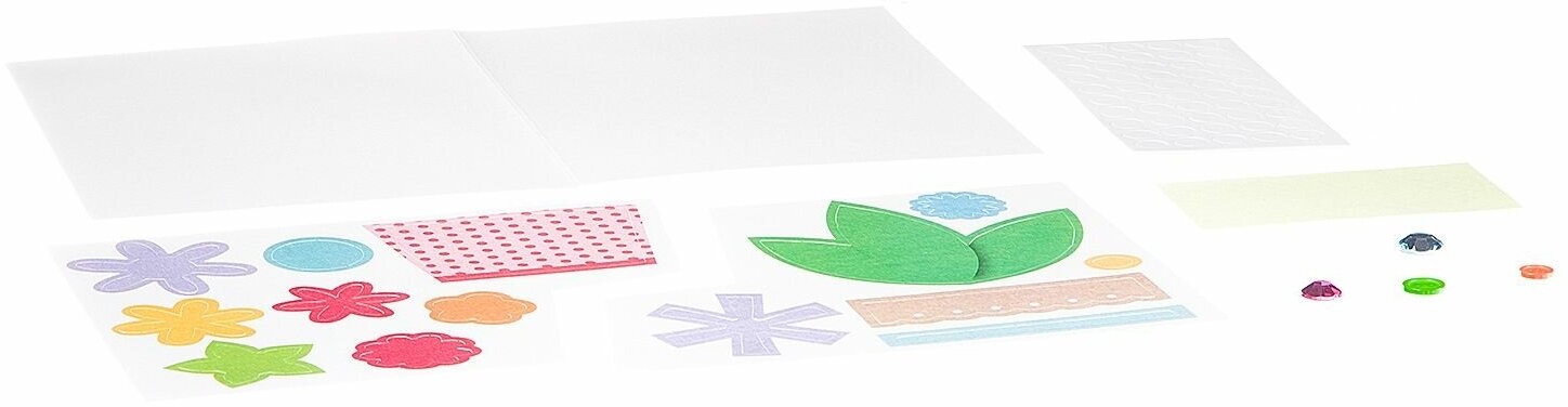 В наборе: основа для открытки, материалы для аппликации и украшения (бумажные, тканевые, пластиковые элементы), двусторонний скотч.