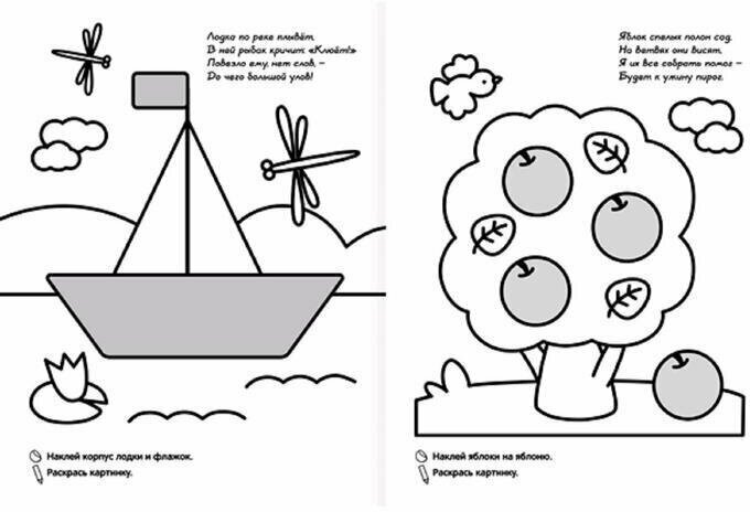 Раскраски с наклейками для малышей Паровоз создана специально для самых маленьких детей. Уже в 1 год ребенок сможет выполнить несложные задания: приклеить яблоки на яблоню, крылья сове, елочные украшения и верхушку-звезду на елку и многие другие.