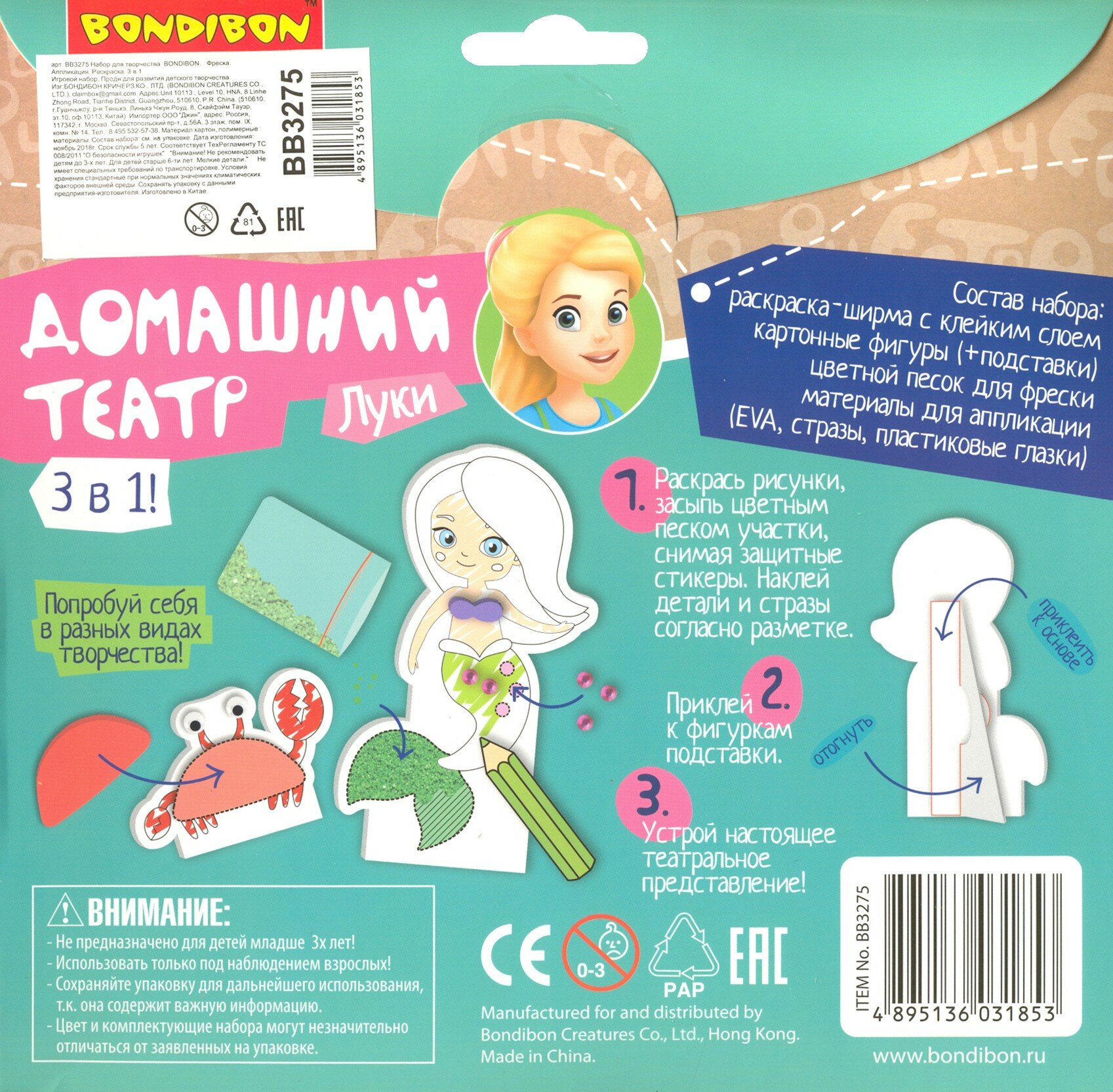 Набор для творчества Bondibon 3в1 "Домашний театр: фреска аппликация раскраска" (ВВ3275)
