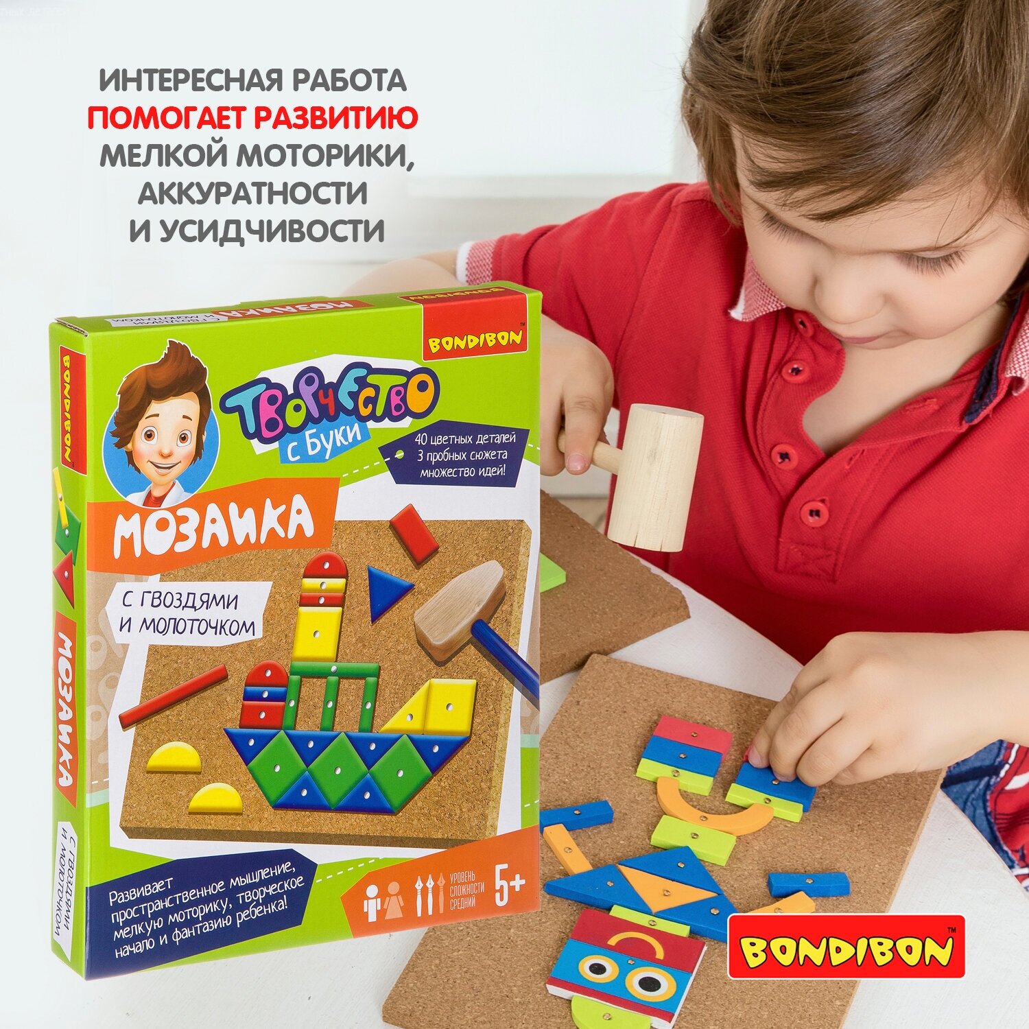 Bondibon Набор для творчества Мозаика с гвоздями и молоточком 1 Увлекательная игра по созданию картинок из деталей, прикрепляемых к основе с помощью гвоздиков. В состав входят пробковая основа, молоточек, гвоздики, яркие детали из EVA разной формы и инструкция с картинками-примерами. Чтобы прикрепить деталь к основе, нужно аккуратно вставить в нее гвоздик и прибить его молоточком. Особых усилий не требуется, детали и пробковая основа мягкие, поэтому гвоздики легко входят в них. Также легко разобрать созданные картинки. Игра отлично тренирует мелкую моторику рук и глазомер ребенка, воображение и фантазию. Гвоздики в игре маленькие и достаточно острые, поэтому, если Вы предложите игру маленькому ребенку нужно, чтобы он постоянно находился под вашим контролем.