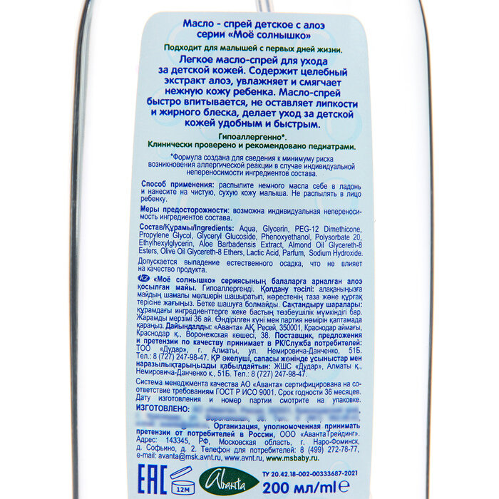 Масло-спрей "Мое солнышко" с алоэ 200мл Моё солнышко (МФ14149)