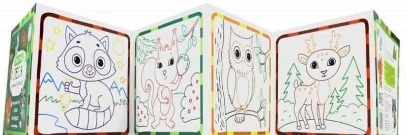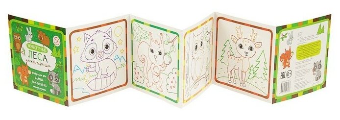 Это не просто книжка-гармошка, это еще и раскраска с изображением животных леса: белочки, совы, зайчика и др. Цветные контуры помогут малышу сориентироваться в выборе нужного карандаша для раскрашивания картинки.