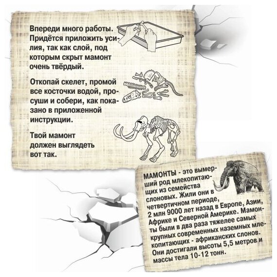 | Комплектация | блок для раскопок, молоток, зубило, кисточка, губка, скелет мамонта |