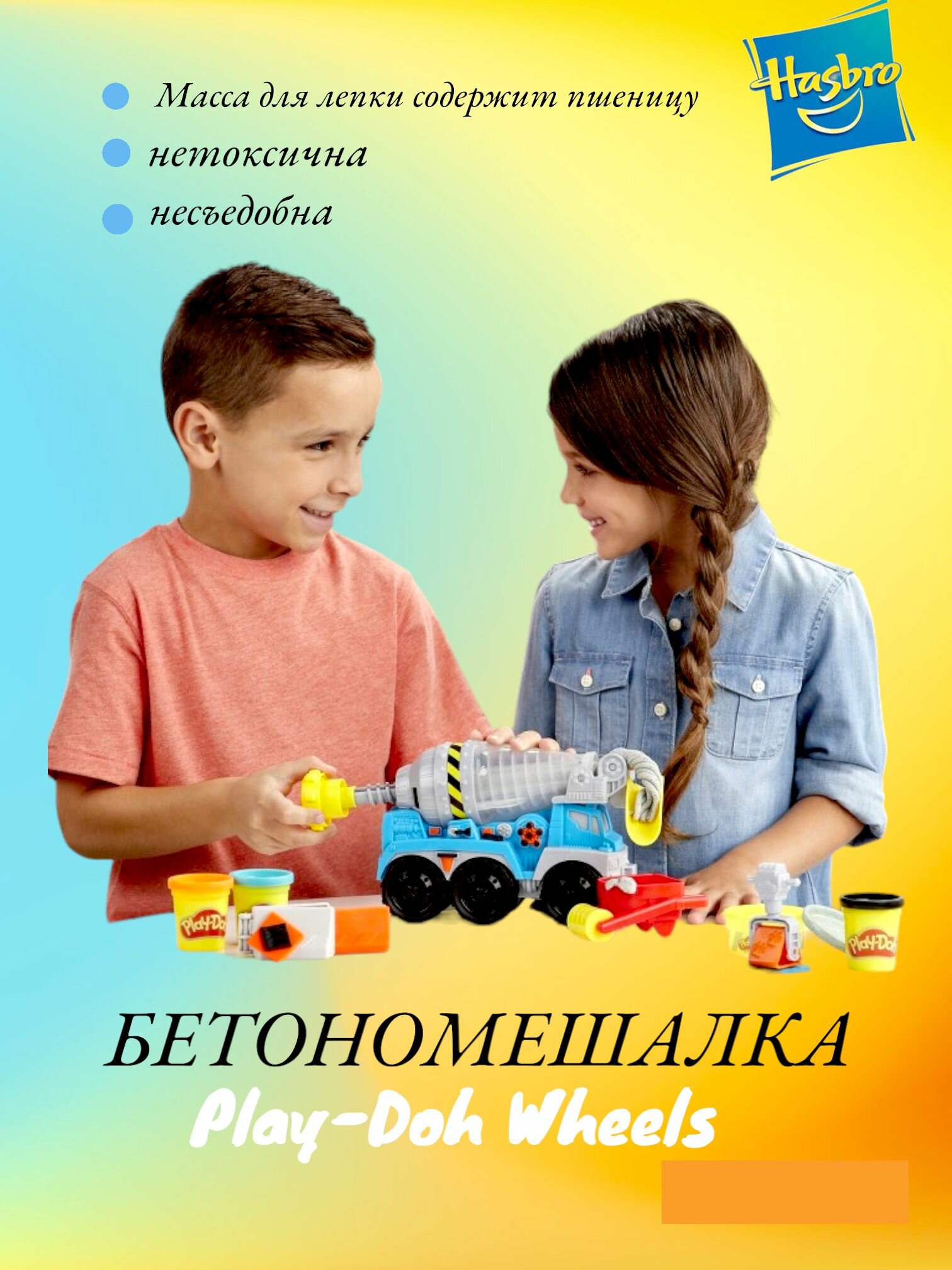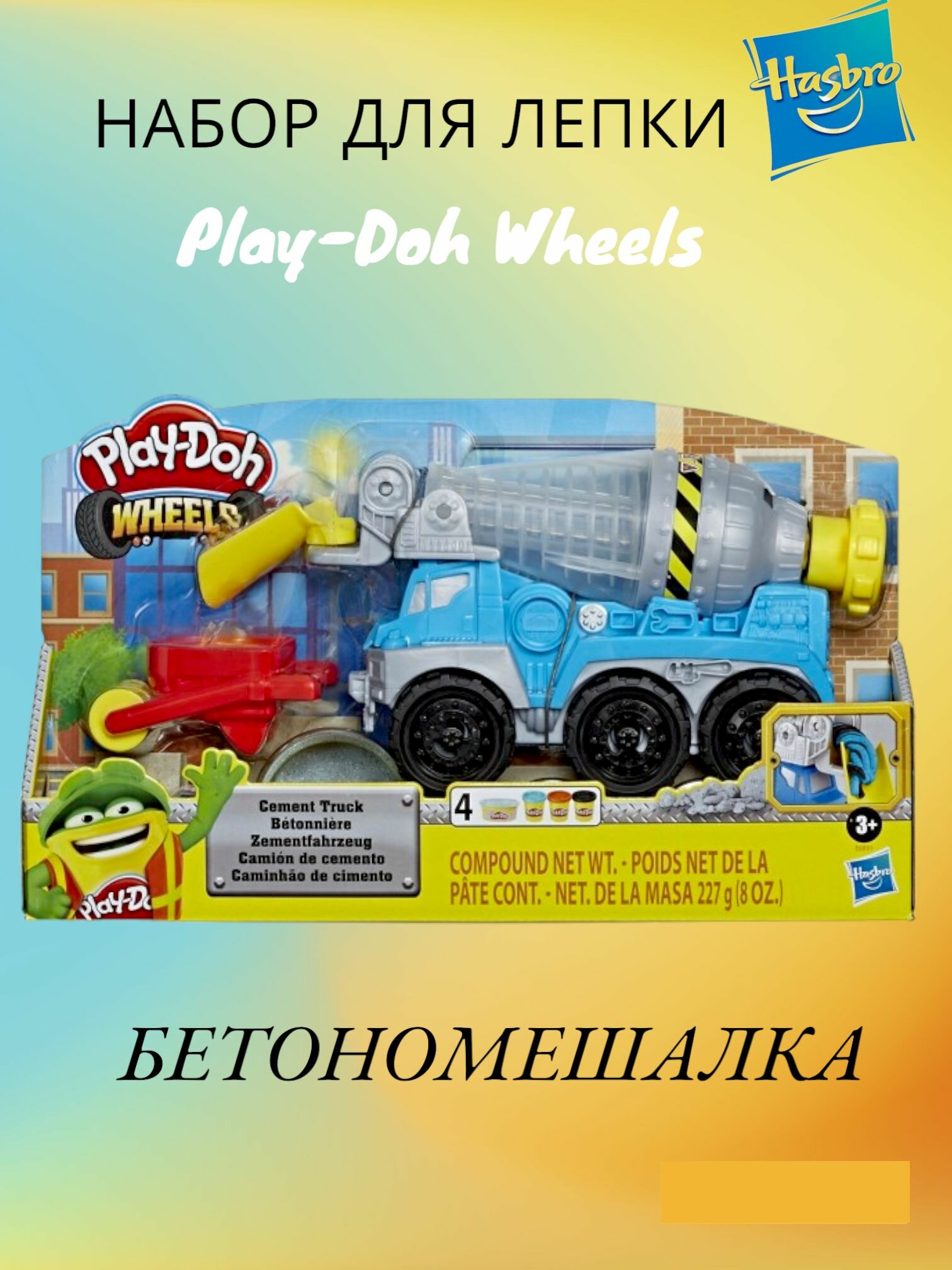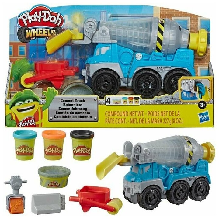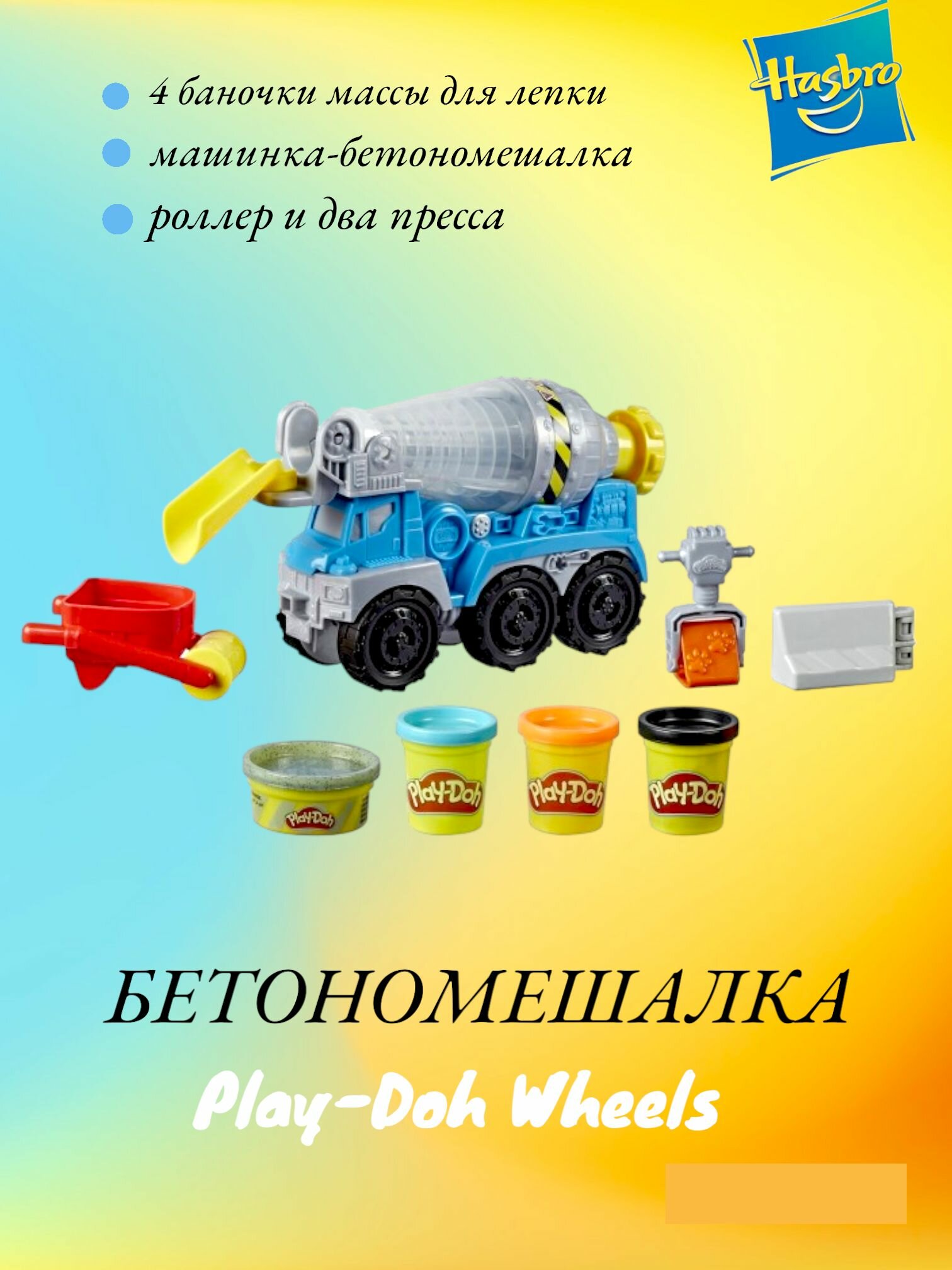 Play-Doh Набор для лепки Wheels Бетономешалка о поможет юным строителям сделать свою собственную дорогу. Ваш малыш будет с интересом наблюдать за вращающимся барабаном, внутри которого смешивается масса для лепки Плей-До. При повороте ручки готовая цементная смесь вытечет наружу. Не забудьте перегородить дорогу ограждением на время проведения строительных работ. Пресс в форме бурильного молота и роллер в форме тачки сделают игру еще увлекательнее! Особенности: Машинка-бетономешкалка для смешивания массы для лепки Идет в комплекте с 3 дополнительными инструментами: пресс в форме пневматического молота, пресс в форме дорожного заграждения, роллер в форме тачки 1 баночка со строительной массой со сверкающими вкраплениями, похожая на цемент 3 баночки с нетоксичной массой для лепки разных цветовссы для лепки разных цветов (каждая весом 56 г) вдохновят детей на творчество. В комплекте: 4 баночки массы для лепки (вес нетто: 227 г) машинка-бетономешалка аксессуары инструкции.