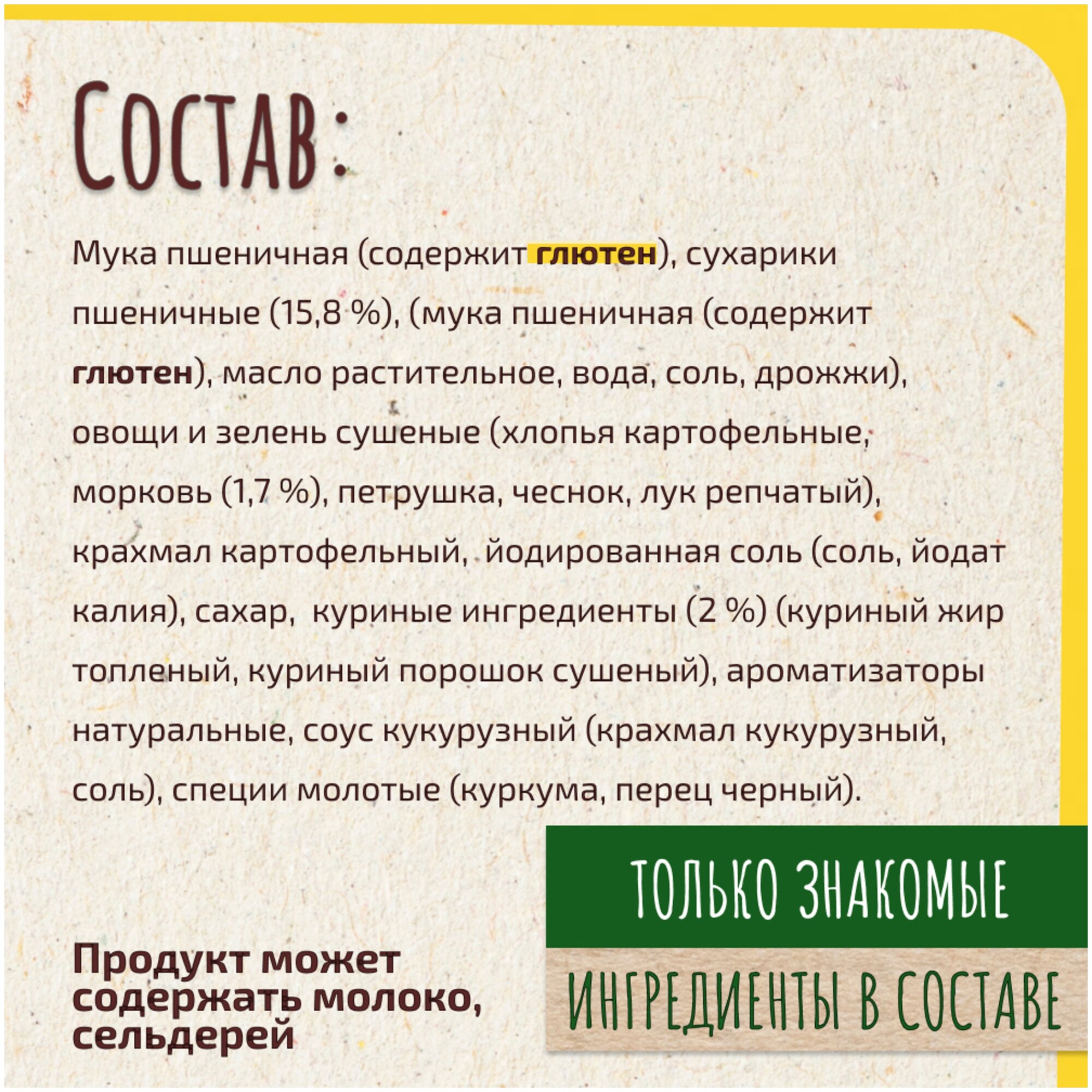 | Состав | Мука пшеничная (содержит глютен), крахмал картофельный, сухарики пшеничные (15,8 %) (мука пшеничная (содержит глютен), вода, масло растительное, соль, дрожжи), овощи и зелень сушеные (картофельные хлопья, морковь (1,7 %), петрушка, чеснок, лук репчатый), йодированная соль (соль, йодат калия), сахар, сухой сироп глюкозы, ароматизаторы, куриные ингредиенты (2 %) (жир куриный топленый, куриный порошок сушеный), специи молотые (куркума, перец черный). Продукт может содержать молоко, сельдерей. |