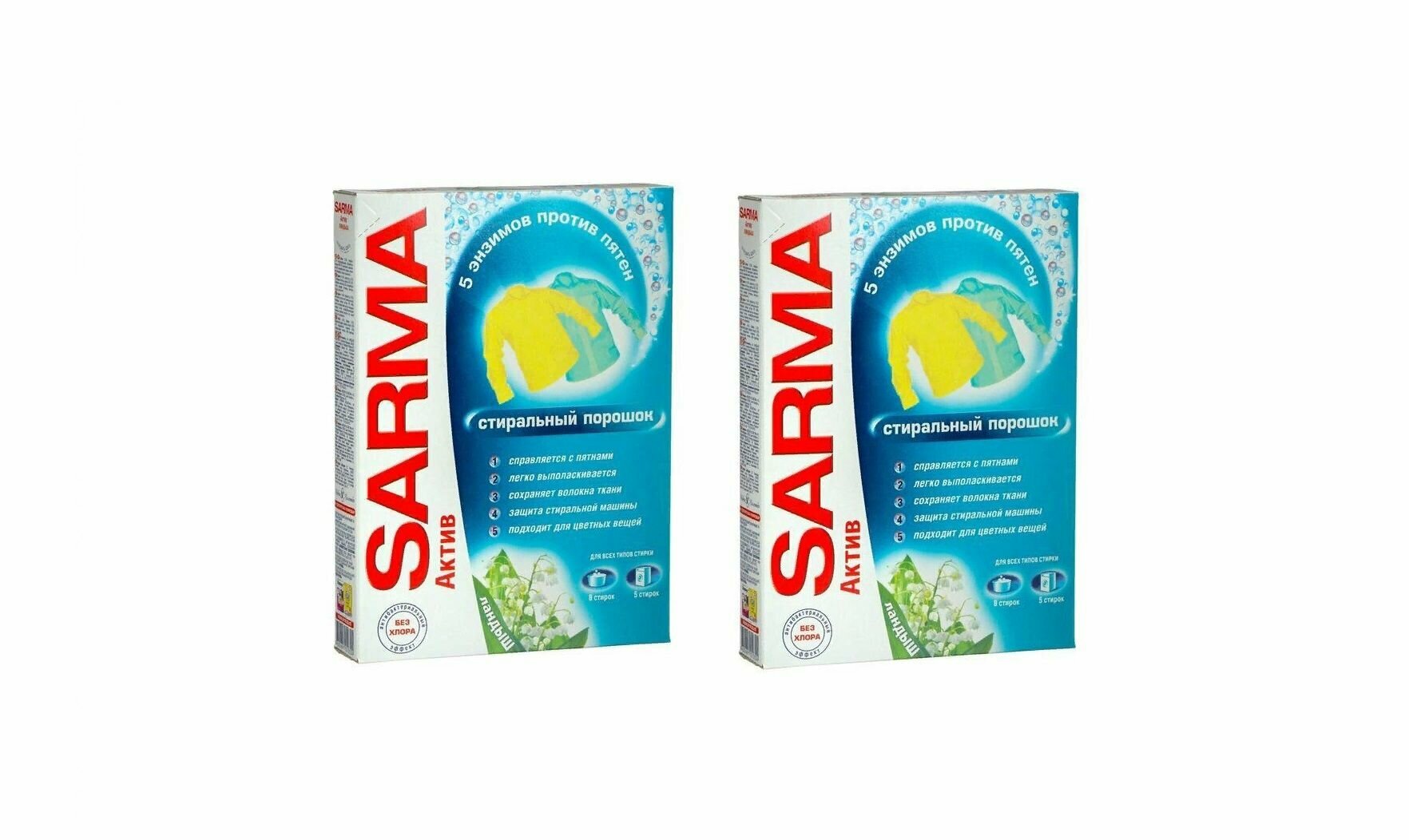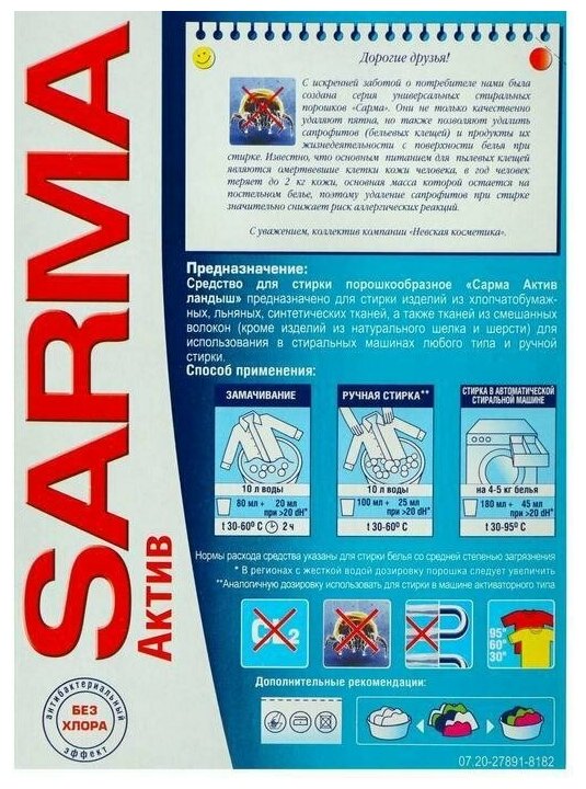 Средство для стирки порошкообразное "Сарма Актив ландыш" предназначено для стирки изделий из хлопчатобумажных, льняных, синтетических тканей, а также тканей из смешанных волокон (кроме изделий из натурального шелка и шерсти), для использования в стиральных машинах любого типа и ручной стирки.