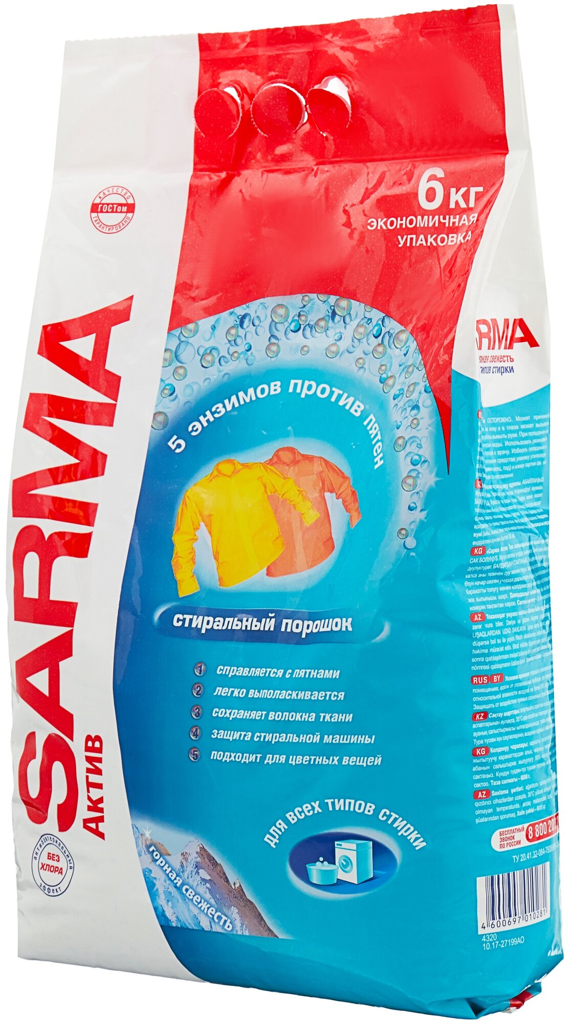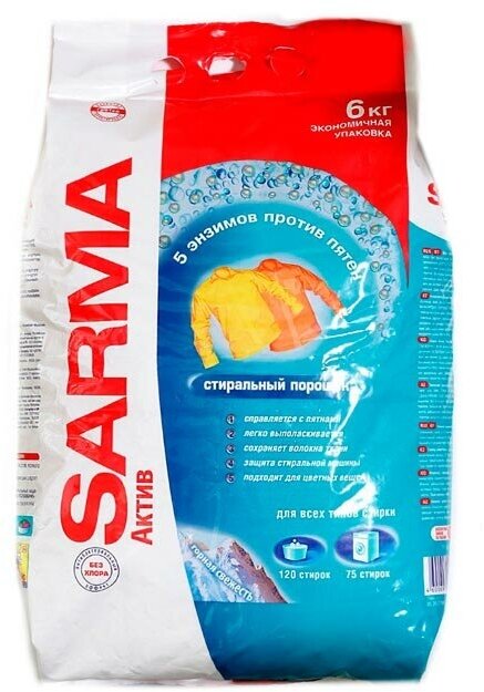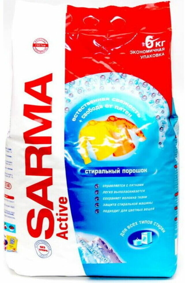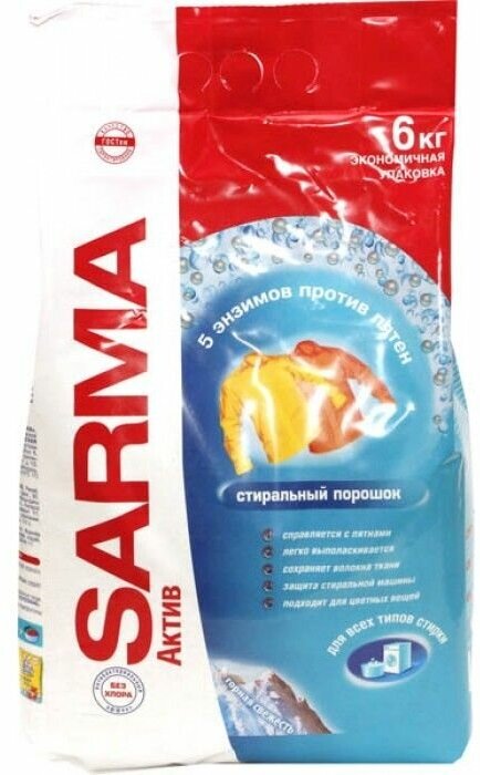 5 энзимов против пятен: 1. Справляется с пятнами. 2. Легко выполаскивается. 3. Сохраняет волокна ткани. 4. Защита стиральной машины. 5. Подходит для цветных вещей. Антибактериальный эффект без хлора. Дорогие друзья! С искренней заботой о потребителе нами была создана серия универсальных стиральных порошков "Сарма". Средство для стирки порошкообразное "Сарма Актив горная свежесть" предназначено для стирки изделий из хлопчатобумажных, льняных, синтетических тканей, а также тканей из смешанных волокон в автоматических стиральных машинах и ручной стирки.