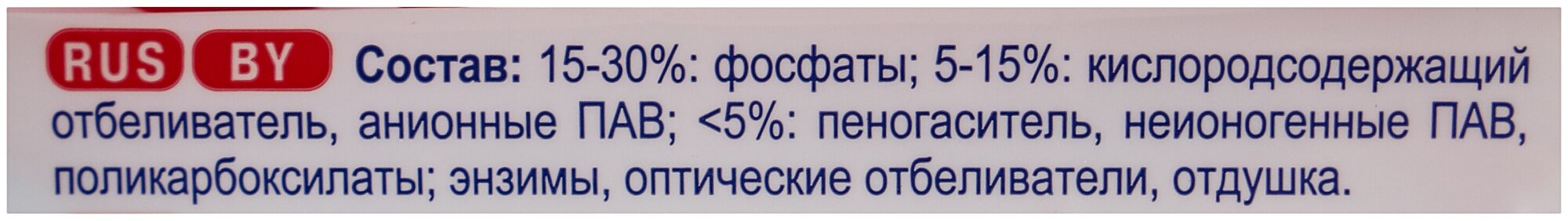 | Способ применения | замачивание - 10 л воды - 80 мл порошка при температуре 30-60°с на 2 часа. ручная стирка - 10 л воды - 100 мл порошка при температуре 30-60°с. стирка в автоматической стиральной машине - на 4-5 кг белья - 180 мл порошка при температуре 30-95°с. норма расхода средства указаны для стирки белья со средней степенью загрязнения. в регионах с жесткой водой дозировку порошка следует увеличить. начинайте стирку вручную и замачивание после полного растворения порошка. для сильно загрязненных изделий дозировку порошка следует увеличить на 50 мл. при необходимости в автоматических стиральных машинах используйте функцию "дополнительное полоскание". для шерстяных и деликатных тканей используйте специальных стиральных порошок "ворсинка". для стирки детского белья используйте специальный стиральный порошок "ушастый нянь". |