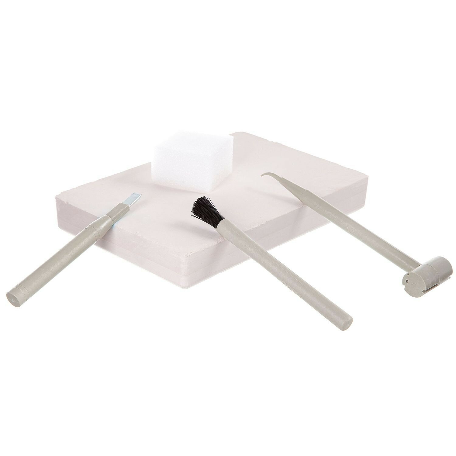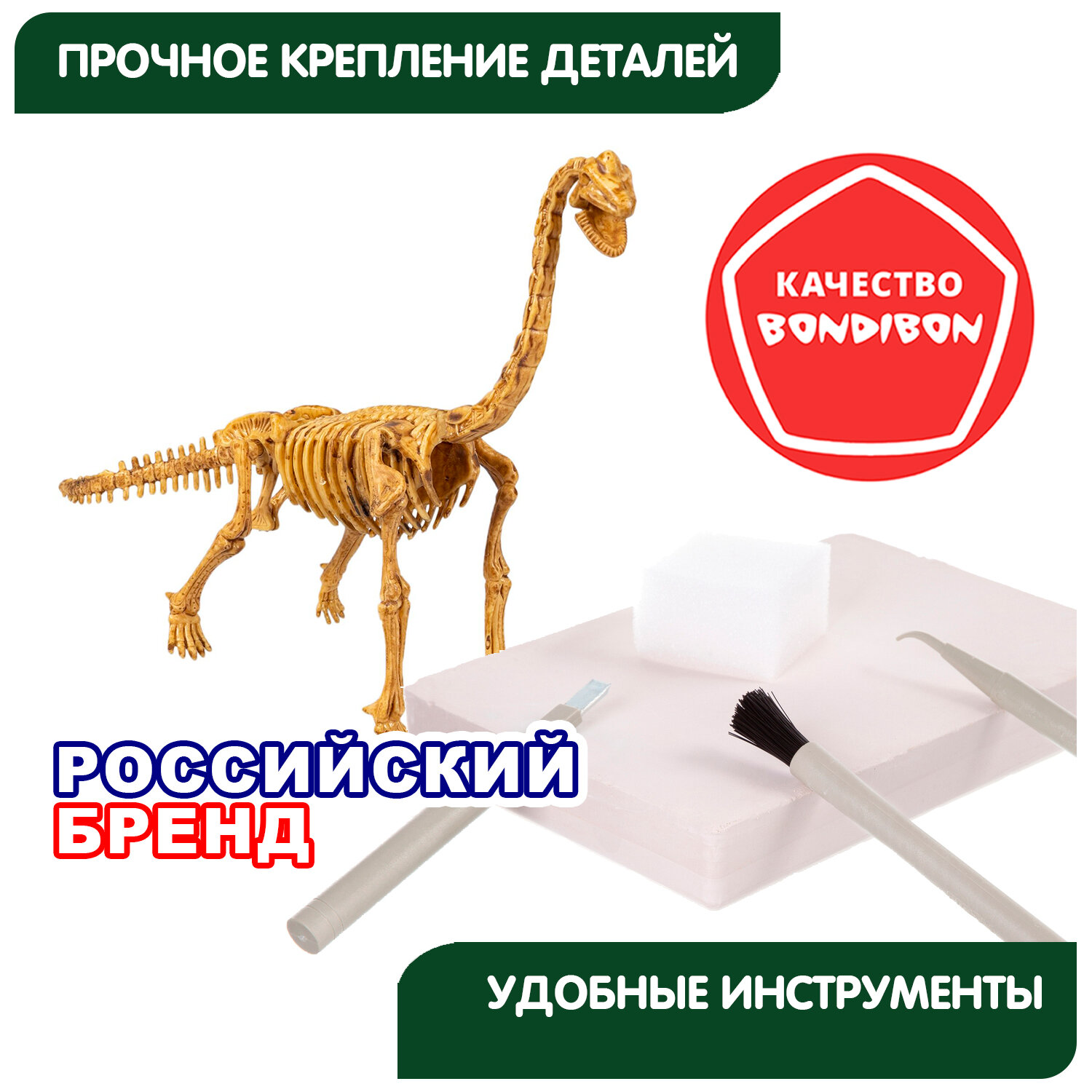 В состав набора входят блок для раскопок, молоток, зубило, кисточка, губка, скелет динозавра.