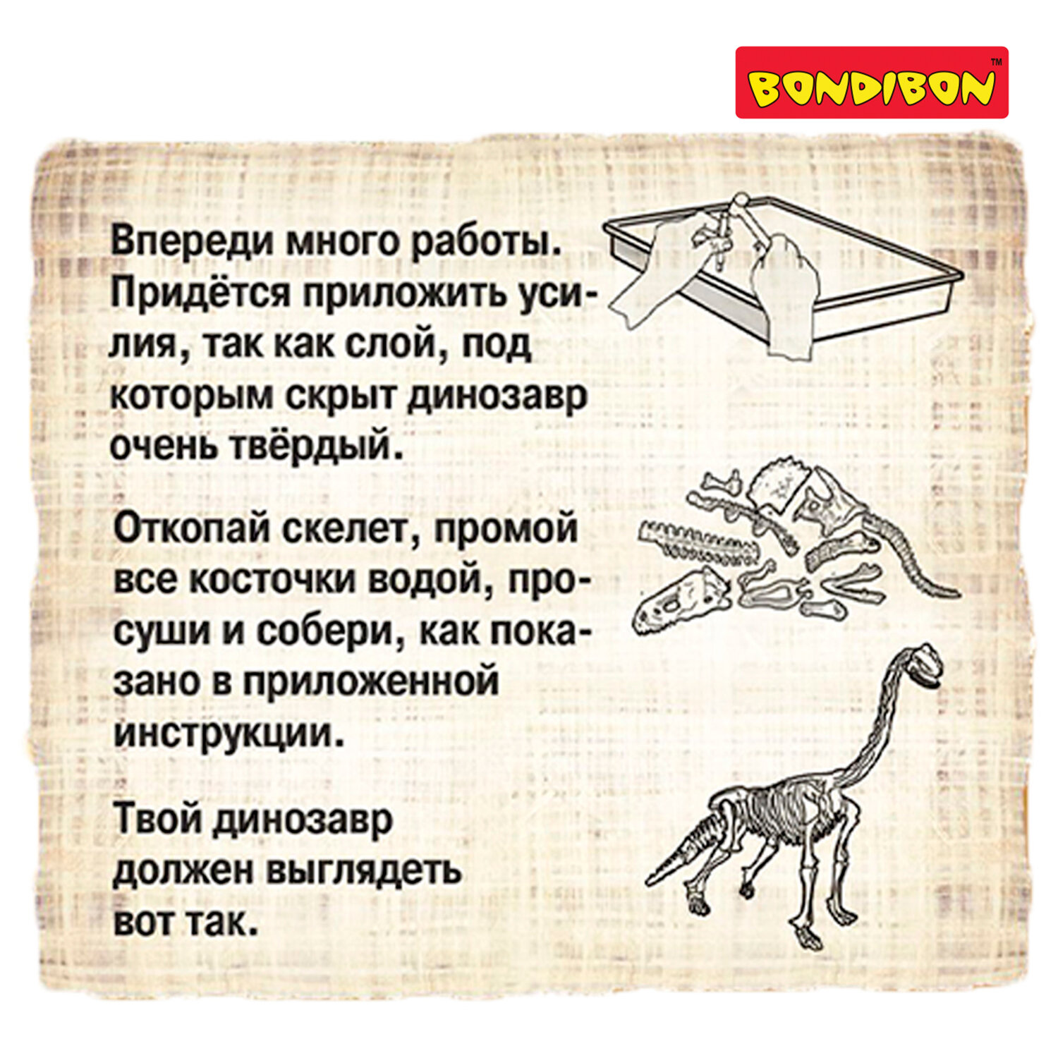 | Комплектация | блок для раскопок, молоток, зубило, кисточка, губка, скелет динозавра |