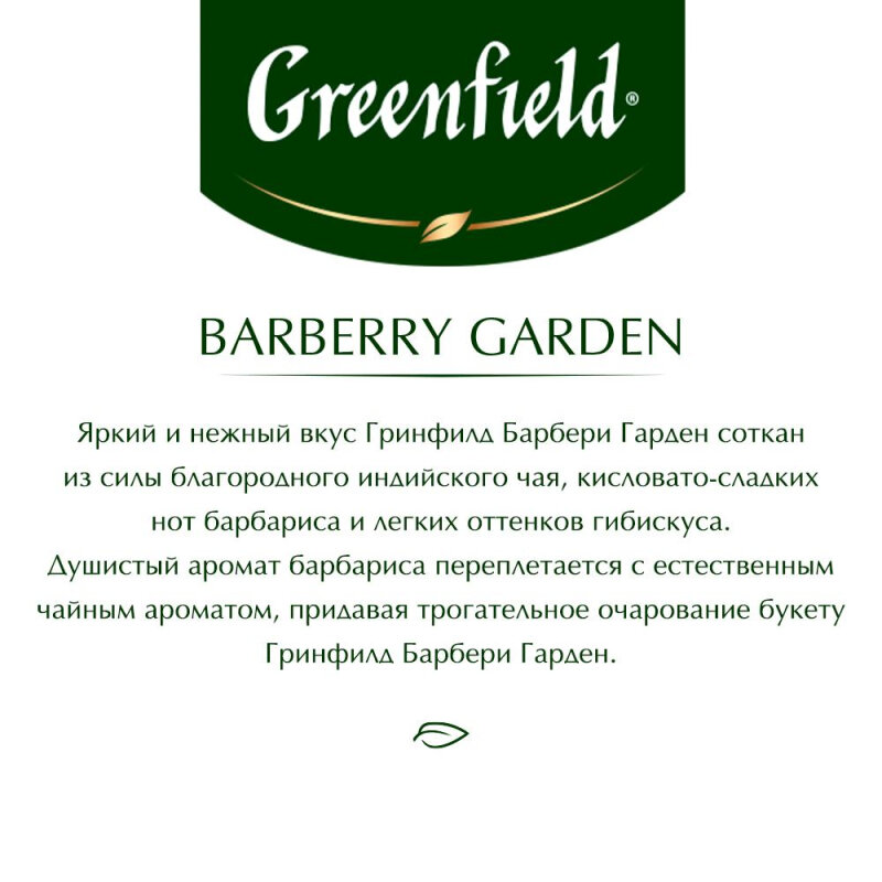 Гринфилд Барбери Гарден - это черный индийский чай с ярким и нежным вкусом кисловато-сладких нот барбариса и легких оттенков гибискуса. Душистый аромат барбариса, лепестки василька переплетаются с естественным чайным ароматом придавая трогательное очарование букету Greenfield Barberry Garden. Саше из специальной фольги сохраняет свежесть чая.