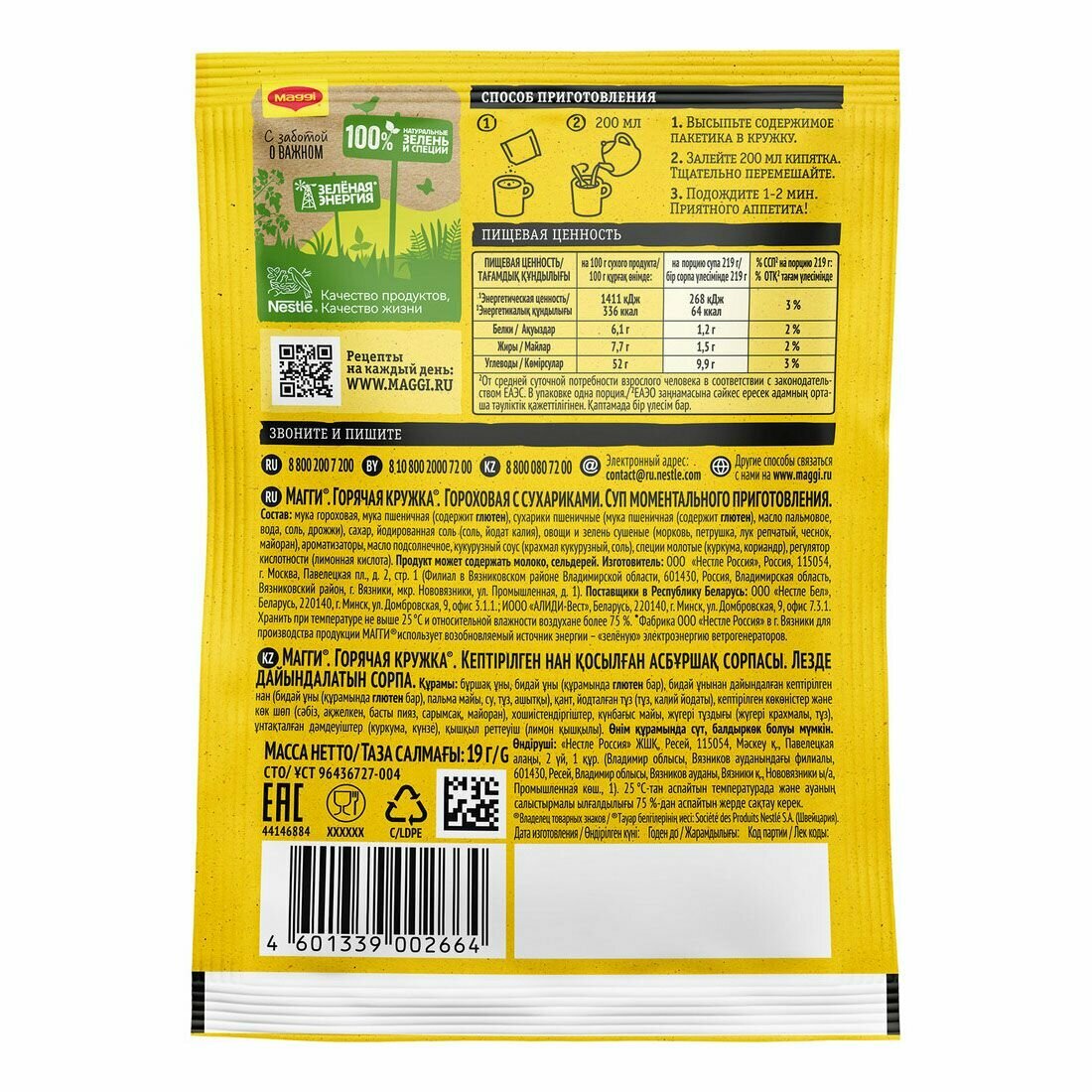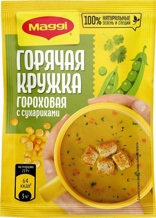 Горячие супы являются важной составляющей нашего рациона и содержат необходимые организму питательные вещества. MAGGI® Горячая кружка® гороховая, в составе которой кусочки натуральных овощей, душистых трав и специй, в сочетании с хрустящими сухариками прекрасно утолит голод и согреет вас в любой ситуации. Не содержит консервантов.