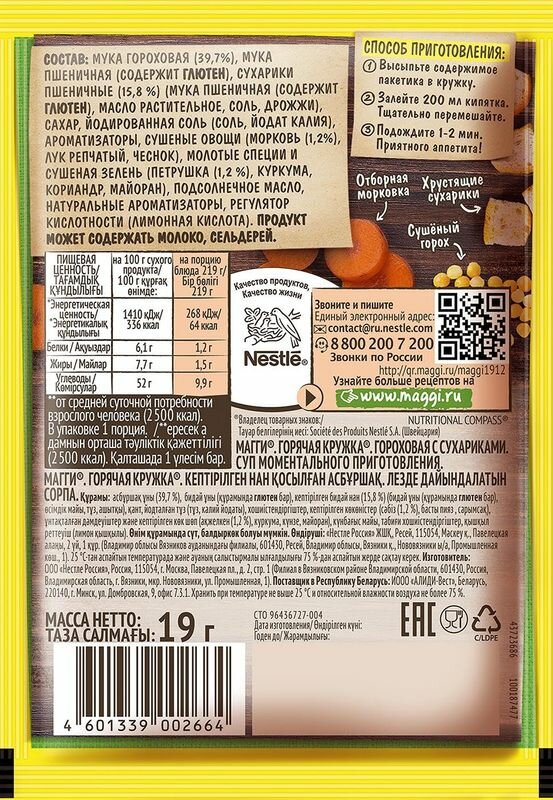 | Состав | Мука гороховая, сухарики (мука пшеничная, пальмовое масло, соль, дрожжи), мука пшеничная, мальтодекстрин, йодированная соль, сахар, ароматизаторы (гриль, желтый горошек, кулинарная база, говядина, вареный лук, спаржа, горох) и натуральный (экстракт черного перца)), овощи (морковь, лук, чеснок (порошок)), кулинарный жир (из пальмового масла), специи и пряные травы (петрушка, куркума, кориандр, майоран), усилители вкуса и аромата (глутамат, гуанилат инозинат натрия), пальмовое масло, загуститель (ксантановая камедь), лактоза (из молока), казеинат натрия (из молока), регулятор кислотности (лимонная кислота), стабилизатор (цитраты натрия). |