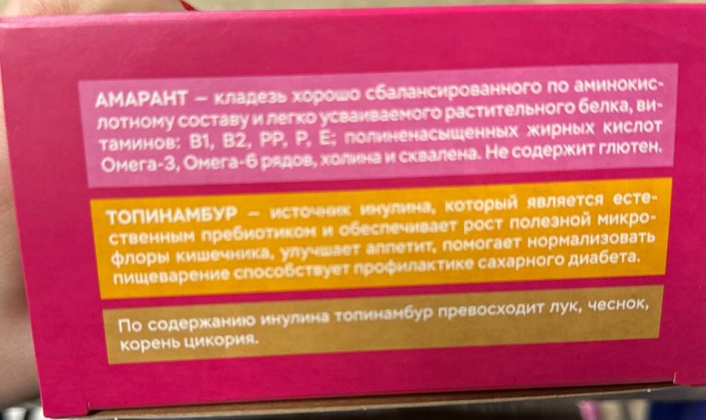 | Состав | мука амарантовая, мука рисовая, мука кукурузная, топинамбур сушеный, соль |