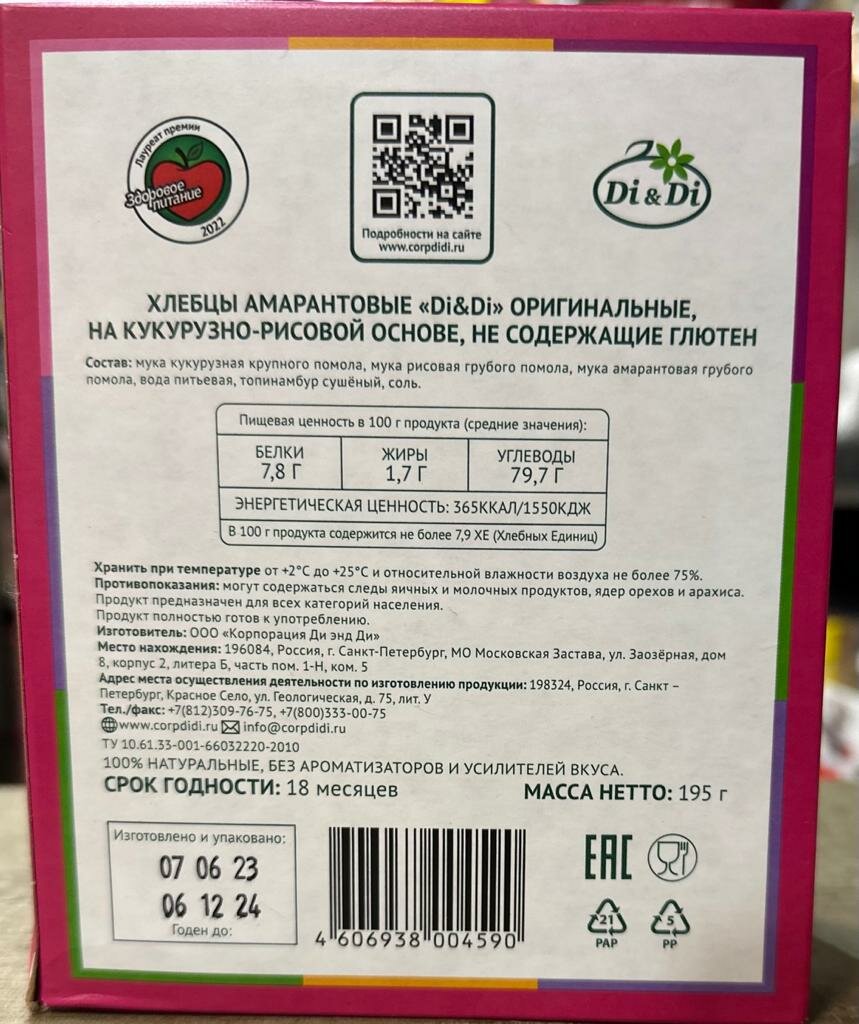 На сегодняшний день товар «Хлебцы амарантовые кукурузно-рисовые 195гр Di&Di (0574)» можно купить с кешбеком в 1 магазине: Яндекс.Маркет
