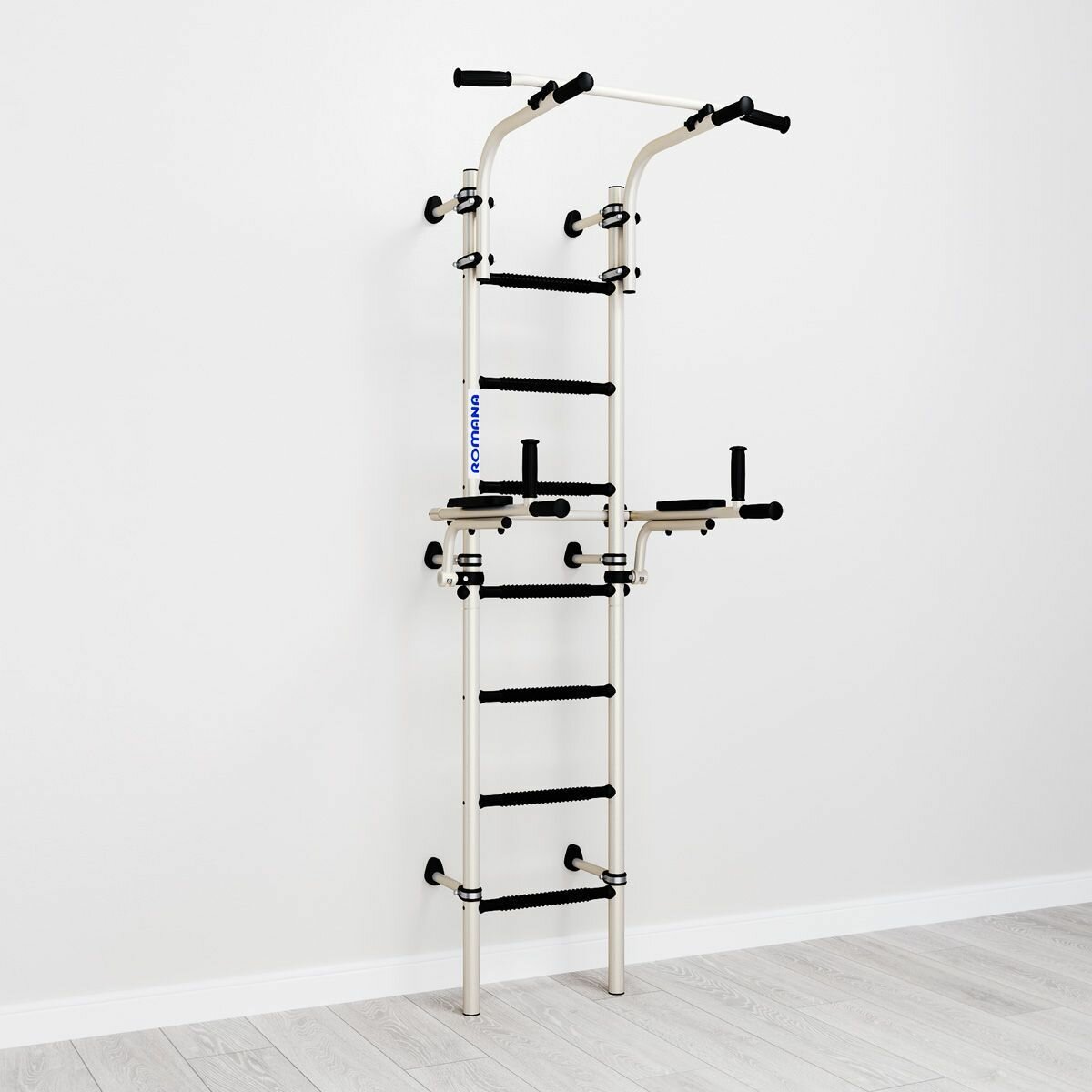 Romana S10 - домашний спортивный комплекс для всей семьи, на нем могут заниматься и дети, и взрослые. Он достаточно компактен и не занимает много места: ширина ступеней составляет 41 cм, это самый оптимальный размер для занятий на брусьях, которые идут в комплекте. Брусья откидные и после занятий их можно перевести в вертикальное положение. Турник можно передвигать по высоте и закрепить как удобно пользователю с помощью надежных современных хомутов. Спортивный комплекс фиксируется к стене, фиксаторы можно п...