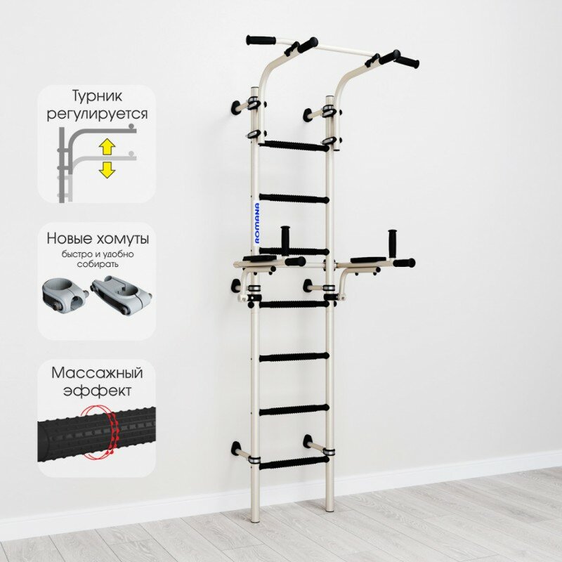 Romana S10 - домашний спортивный комплекс для всей семьи, на нем могут заниматься и дети, и взрослые. Он достаточно компактен и не занимает много места: ширина ступеней составляет 41 cм, это самый оптимальный размер для занятий на брусьях, которые идут в комплекте. Брусья откидные и после занятий их можно перевести в вертикальное положение. Турник можно передвигать по высоте и закрепить как удобно пользователю с помощью надежных современных хомутов. Спортивный комплекс фиксируется к стене, фиксаторы можно п...