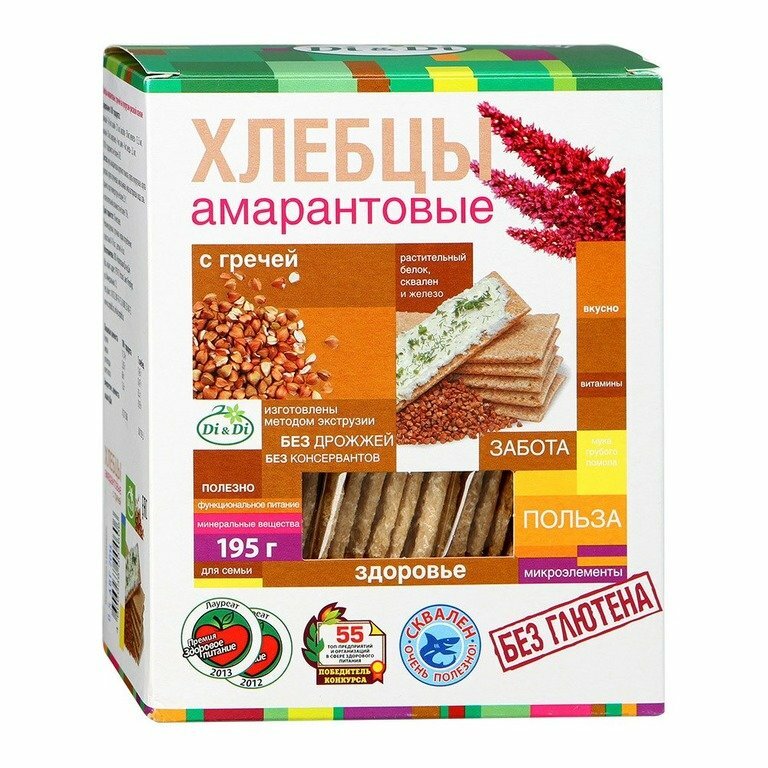 B1, В2, Е, D, РР; полиненасыщенных жирных кислот омега-3, омега-6 рядов, холина. Достоинство амаранта - наличие сквалена, положительно влияющего на обезвреживание свободных радикалов, канцерогенов и других токсичных веществ. Хлебцы амарантовые не содержат глютена.