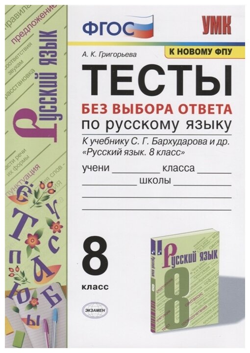 Русский язык. 8 класс. Тесты без выбора ответа к учебнику С.Г. Бархударова и др. (Григорьева Александра Кимовна); Экзамен, 2020