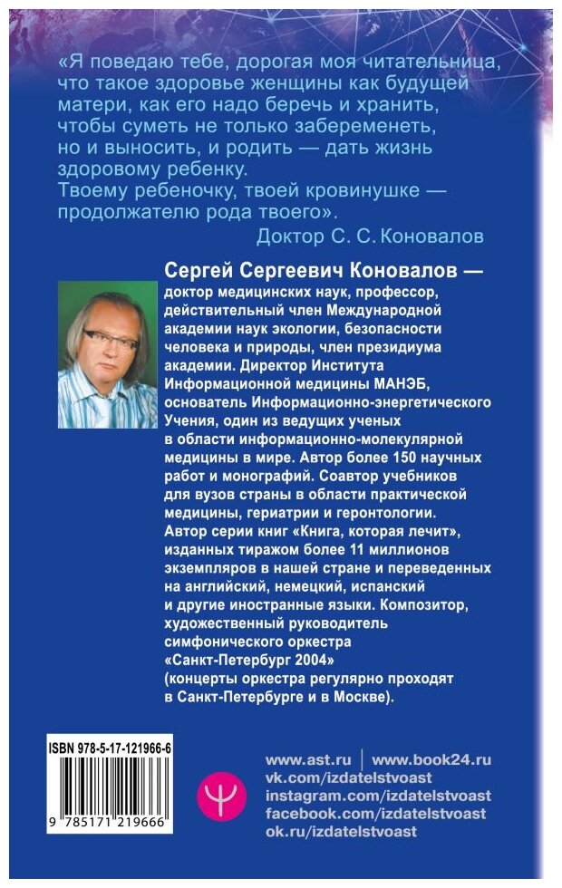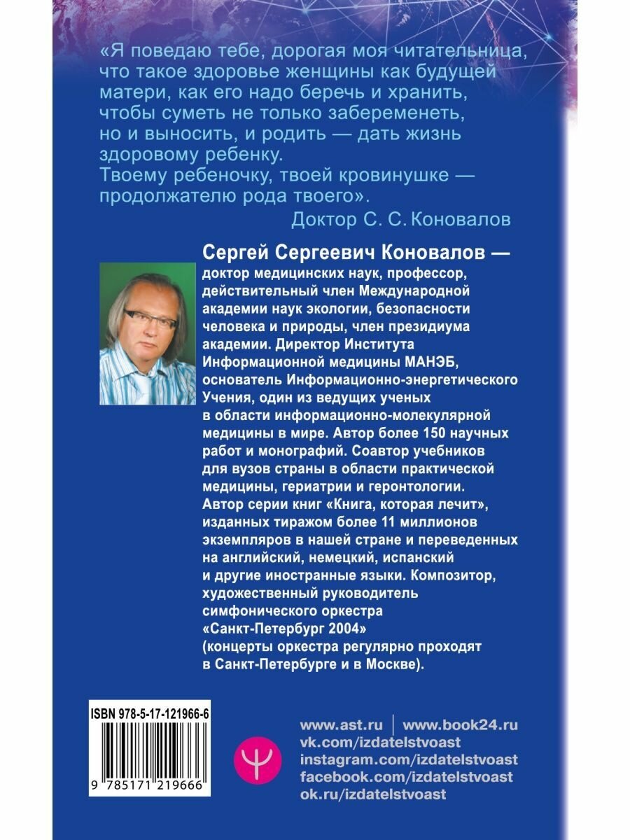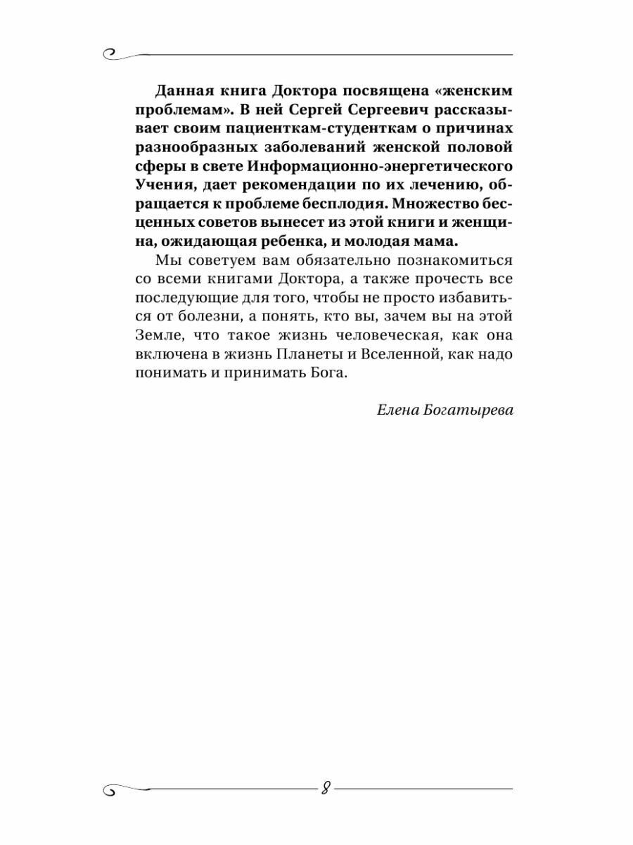 Данная книга доктора С. С. Коновалова посвящена "женским проблемам". В ней Сергей Сергеевич рассказывает своим пациенткам-студенткам о причинах разнообразных заболеваний женской половой сферы в свете Информационно-Энергетического Учения, дает рекомендации по их лечению, обращается к проблеме бесплодия. Множество бесценных советов получит из этой книги женщина, ожидающая ребенка, и молодая мама.