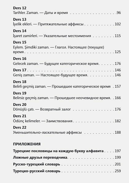 Данное учебное пособие содержит лексический и грамматический материал для изучения турецкого языка с нулевого уровня. Курс разбит на 22 насыщенных урока и рассчитан на прохождение в течение 100 дней. Для отработки языковых навыков и речевых умений предлагается большое количество упражнений с ключами. Пособие также включает много диалогов на турецком языке, полезные приложения, русско-турецкий и турецко-русский словарь. Книга адресована всем, кто хочет овладеть турецким языком, не слишком затягивая процесс изучения, и готов к интенсивным самостоятельным занятиям.