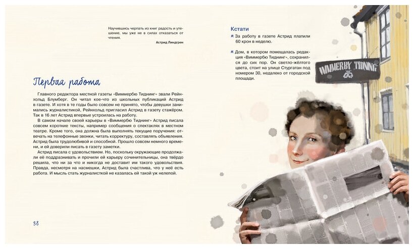 Книги великолепной детской писательницы Астрид Линдгрен широко известны во всём мире. Прочитав множество её сказочных повестей решили дополнить свою коллекцию этой книгой. В ней много интересных фактов о жизни писательницы. Судьбоносные даты её жизни, а также вы узнаете чем вдохновлялась писательница при написании своих книг. Оформление книги великолепное. Плотная мелованная бумага и замечательные иллюстрации. Всем любителям Астрид Линдгрен рекомендую к покупке!!!