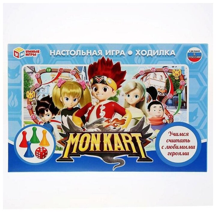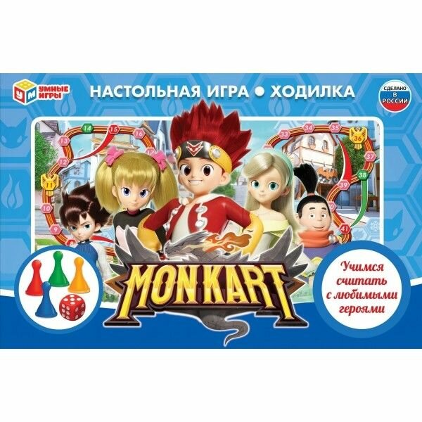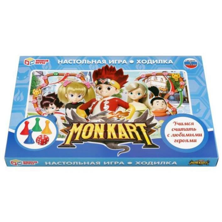 Развивающая настольная игра-ходилка «Монкарт» ТМ «Умные игры».Встречайте яркую настольную игру, которая увлечёт ребёнка. Она создана по сюжету мультсериала «Монкарт»: в королевстве Кармон люди и монстры живут вместе. Они могут участвовать в гоночной лиге «Монкарт». Победить в лиге мечтает каждый, так как чемпион может получить статус рыцаря. Играйте в весёлую настольную игру вместе с ребёнком или же он может пригласить друзей сыграть вместе.Игра «Монкарт» ТМ «Умные игры» 4 в 1:- Весёлая настольная игра-ходилка в стиле мультфильма;- Универсальная и компактная: для игры дома, в гостях, в путешествии;- Для 2-х - 4-х игроков;- Учит ребёнка счёту.Комплектация:- Удобная коробка с изображениями персонажей мультфильма + инструкция;- Кубик;- 4 Разноцветных фишки игроков.Размеры упаковки игры: 33 * 22 * 3 см.Материал: картон.Рекомендуем для детей от 3-х лет.