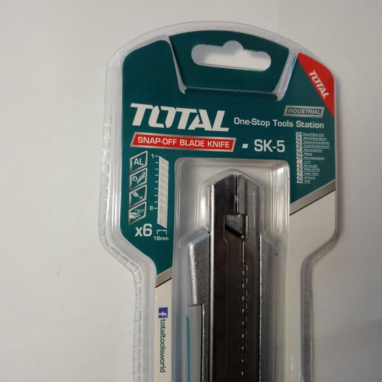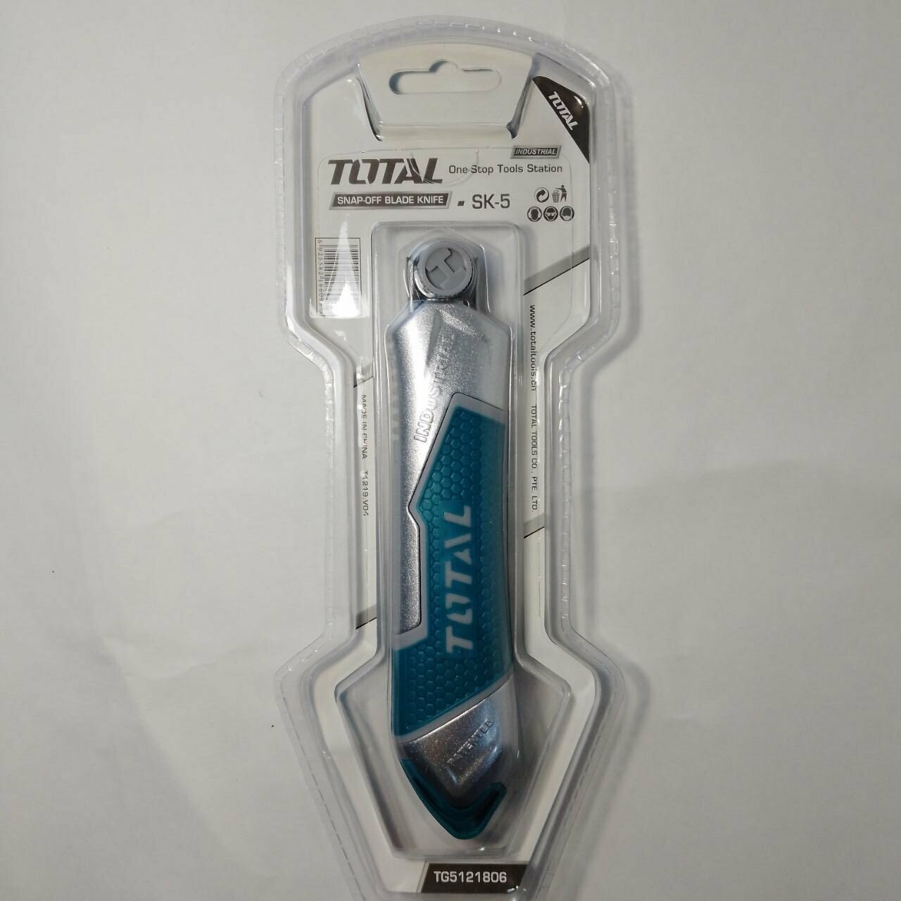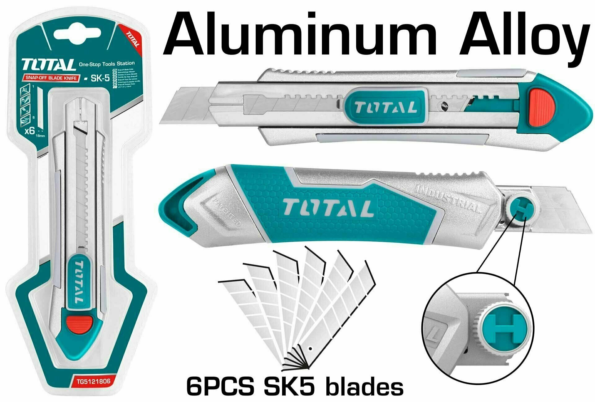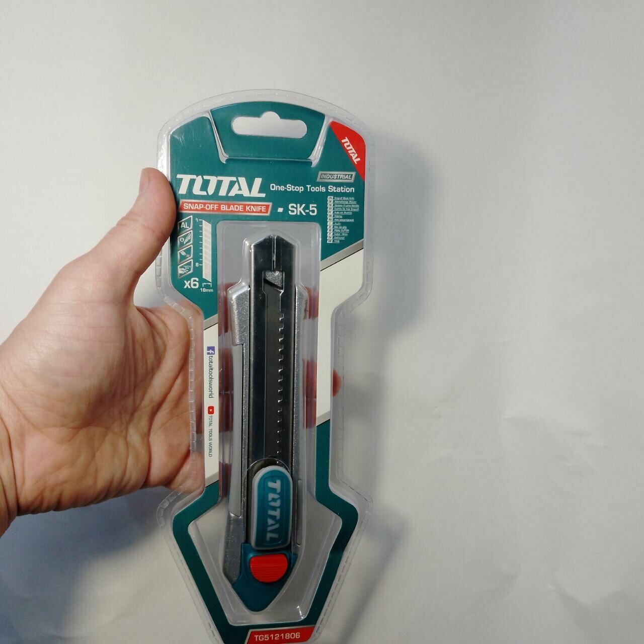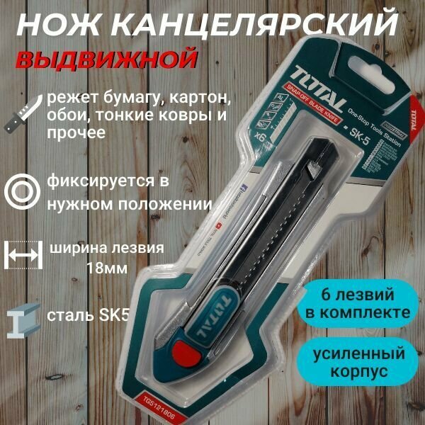 Нож канцелярский строительный Total дниной 185 мм с выдвижным лезвием 18мм режет пластик, линолеум, гипсокартон, бумагу, картон, не толстое ковровое покрытие. Корпус инструмента трехкомпонентный, выполнен из высококачественного пластика и алюминия. Лезвие изготовлено из углеродистой стали SK5, закалено и фиксируется кнопкой. В комплекте 6 лезвий 18*100мм