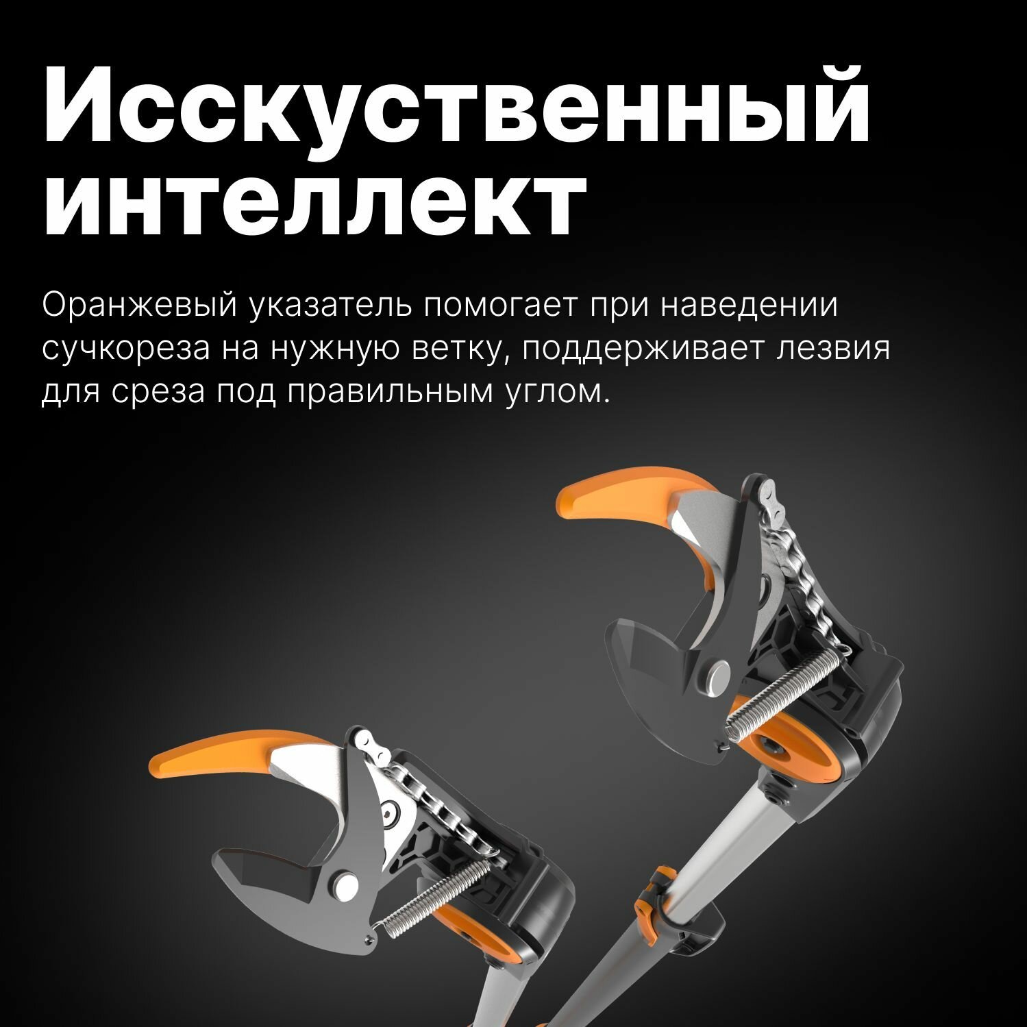 Оснащен указателем угла наклона лезвий — легко направить режущую головку на нужную ветку.