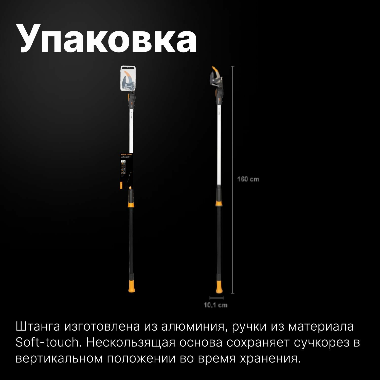 | Прочие особенности и свойства | - Плоскостное лезвие подходит для подрезки свежей, живой древесины диаметром до 32 мм.,- Вертикальный рабочий диапазон до 3,5 метров.,- Регулируемый угол режущей головки 230 С.,- Надежный механизм блокировки штанги.,- Оранжевый указатель помогает при наведении сучкореза на нужную ветку, поддерживает лезвия для среза под правильным углом.,- Штанга изготовлена из алюминия, ручки из материала Soft-touch.,- Нескользящая основа сохраняет сучкорез в вертикальном положении во время хранения.,,Техника подрезки:универсальная |