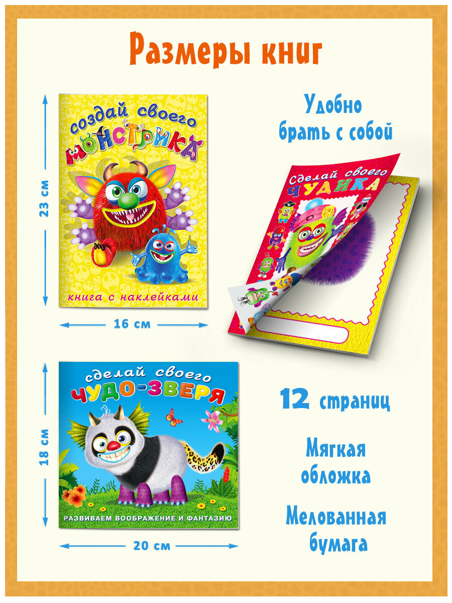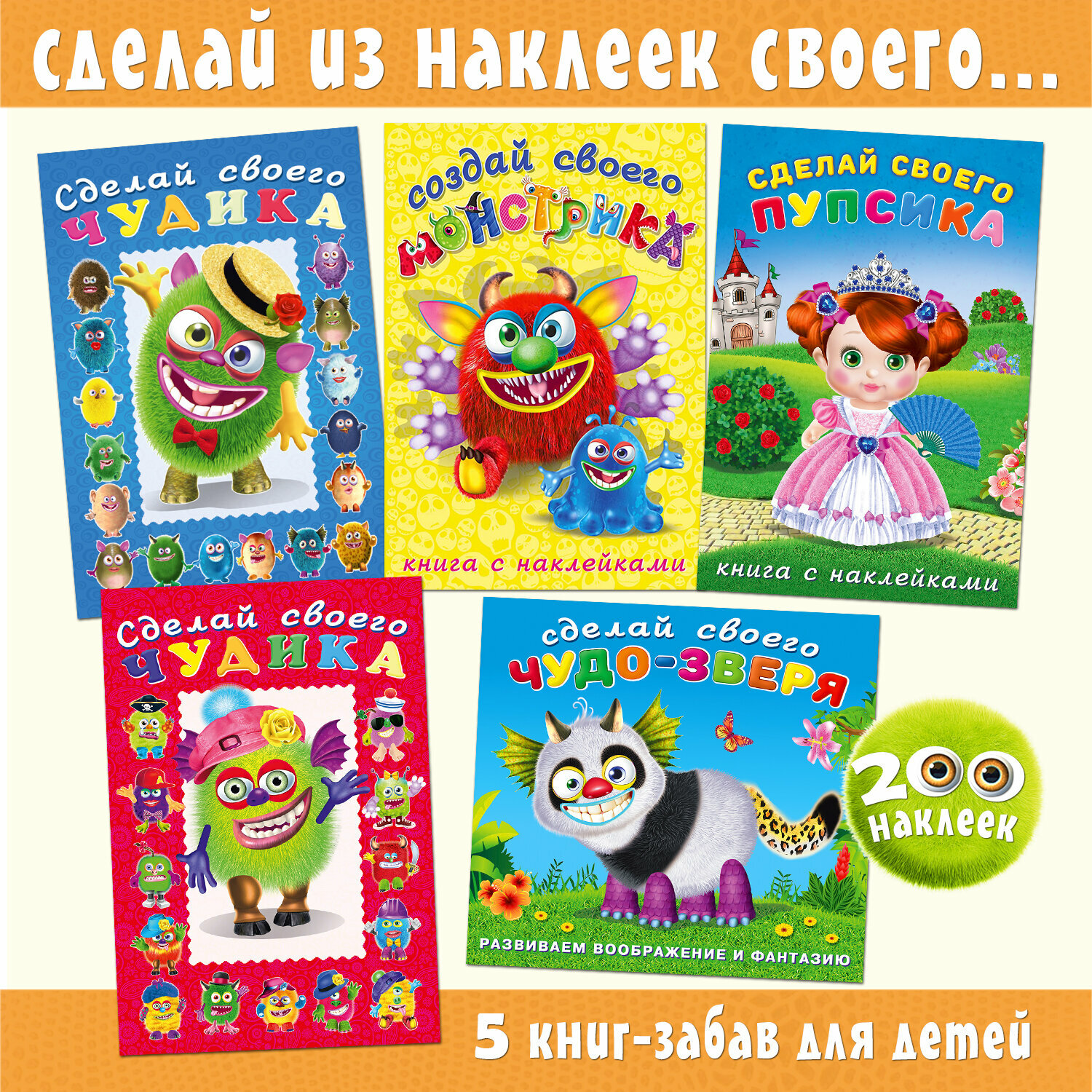 Набор из 5 книг с наклейками для развития воображения, мелкой моторики и творческих способностей ребенка. Малыши сами или с родителями создадут сказочных персонажей и придумают им имена. • "сделай своего чудо-зверя": при помощи 6 шаблонов-основ и 1 листа ярких наклеек можно сделать обычное животное или своего собственного чудо - зверя. Ребенок выберет глаза, нос, уши, подберет лапы и хвост и придумает самого страшного или самого смешного зверя. Под каждой фигуркой есть место, чтобы записать его имя. • "сделай своего чудика": ребятам предлагается создать любого чудика, какого захочется, и назвать его. • "создай своего монстрика": на красочные фоны нужно приклеить веселые наклейки - стикеры и придумать очаровательных монстриков. • "сделай своего пупсика": малыш сможет нарядить 6 прикольных человечков и дать им смешные имена, выбрать кукле прическу, наряд и аксессуары. Также в книжке есть шаблоны с забавными фигурками пупсов для раскрашивания фломастерами или цветными карандашами. В каждом альбоме для творчества есть небольшая инструкция и примеры изображений с названиями, которые простимулируют фантазию детей. Подойдут для занятий в игровой форме дома, в садике, школе, летом, на каникулах, в дороге, для семейного досуга. Рекомендуются для мальчиков и девочек возрастом от 2 лет и старше. Издаются на мелованной бумаге, в мягкой обложке. Отличный подарок в домашнюю библиотеку или в детский сад, на День рождения, любой праздник и просто так без повода. Собери свою коллекцию чудиков!