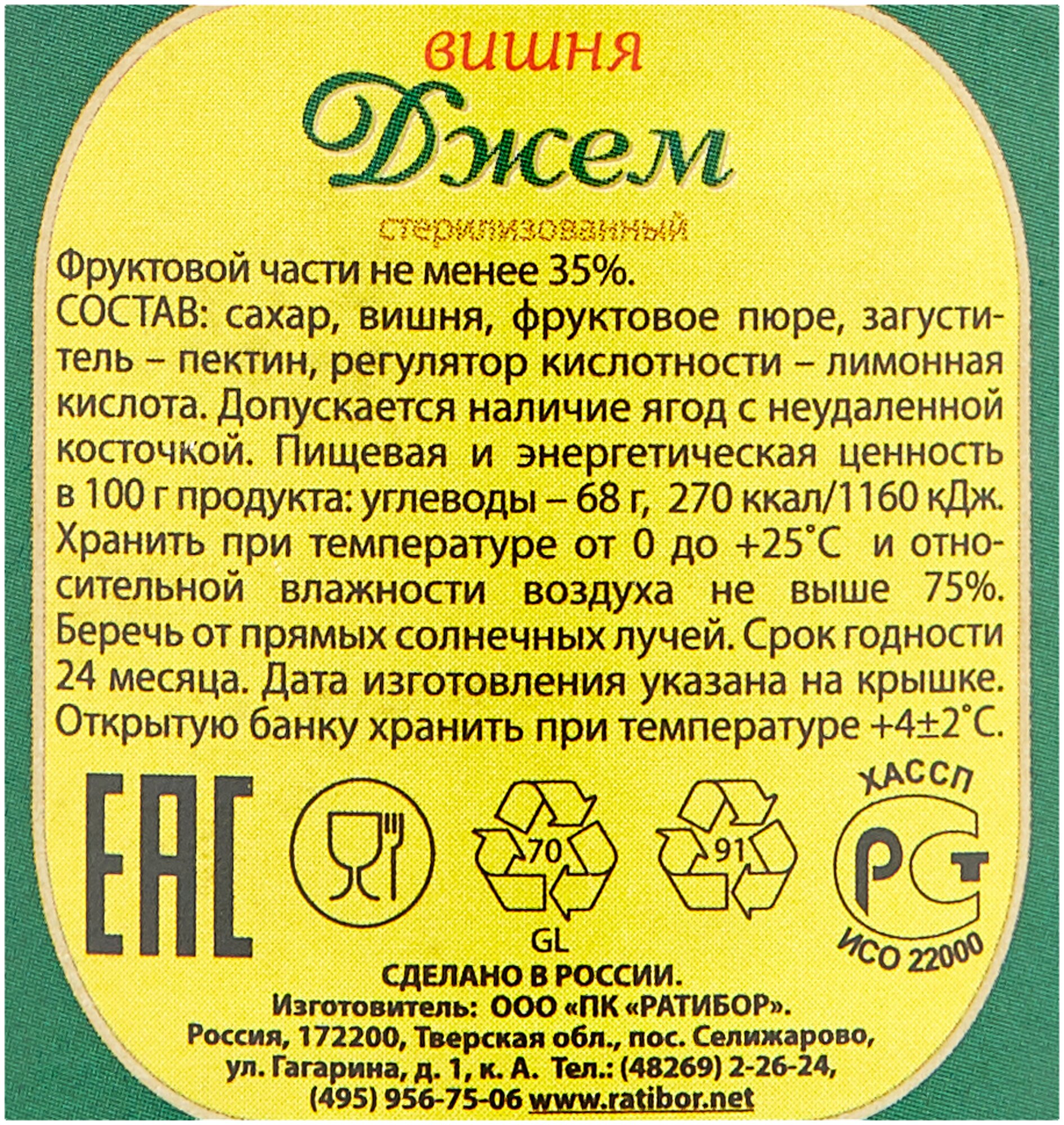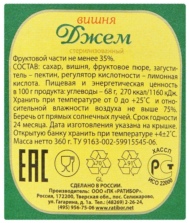 | Состав | Сахар, вишня, фруктовое пюре, загуститель - пектин, регулятор кислотности - лимонная кислота. |