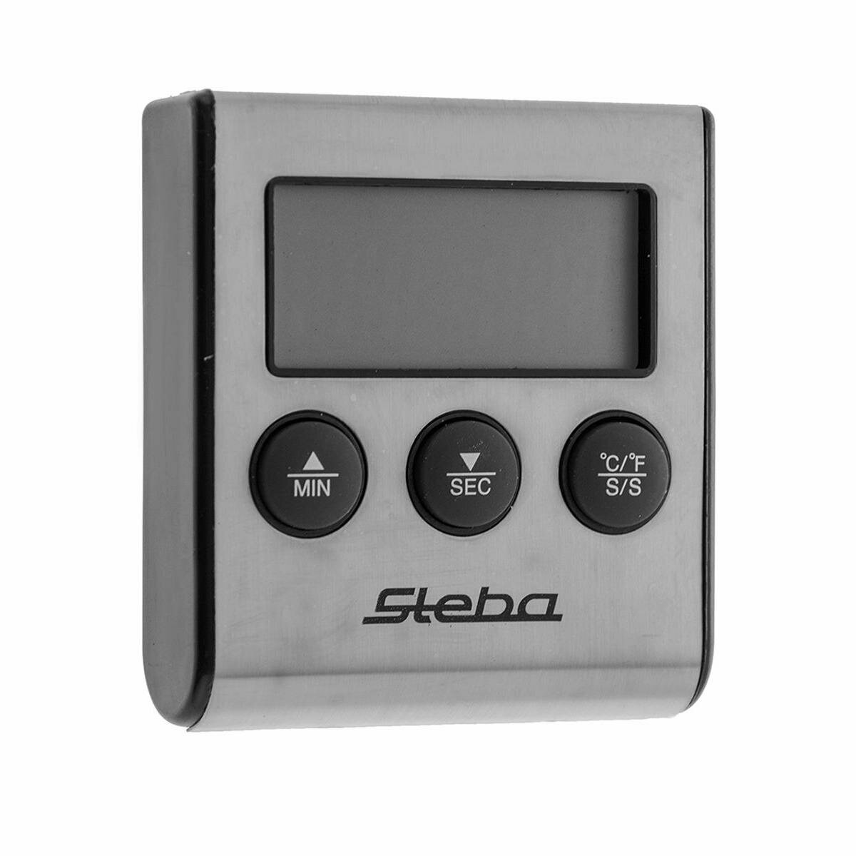 Steba – цифровой кулинарный термометр для мяса с выносным щупом. Измеряет температуру внутри блюд, обычно используется для мяса. Состоит из 2 частей: цифрового блока с индикаторами времени/температуры, а также самого щупа, который подсоединяется к основному блоку через провод. Преимущества такого типа термометра:длинный термостойкий провод 1 метр. Удобно, если нужно измерить температуру блюда в духовке или печидлинный щуп 14.5 см. Удобно, если готовится объемное блюдозвуковое оповещение о готовности по достижению заданной температуры или истечению заданного времени