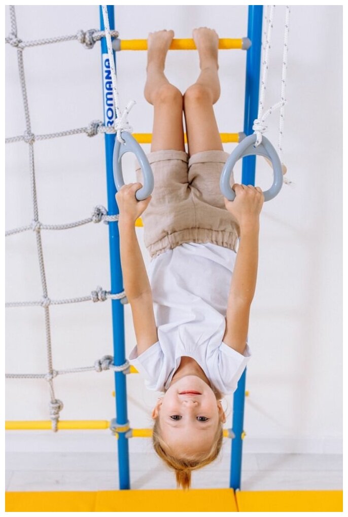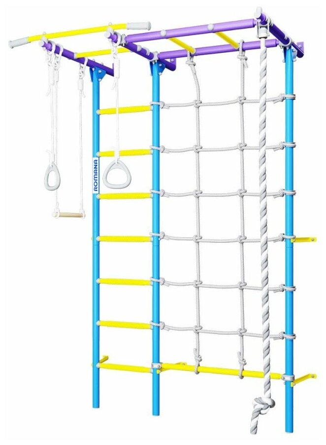 В детском спортивном комплексе Romana S7 есть все, что нужно юному искателю приключений: удобная лестница, веревочный лаз из прочного шнура, рукоход и турник. Также в комплекте идет навесное оборудование: канат, кольца и трапеция. Конструкция комплекса прочная и выдерживает человека весом 100 кг (нагрузка при испытаниях комплекса — 200 кг). Лестница снабжена массажными ступенями, хорошо развивающими тактильные ощущения и моторику.