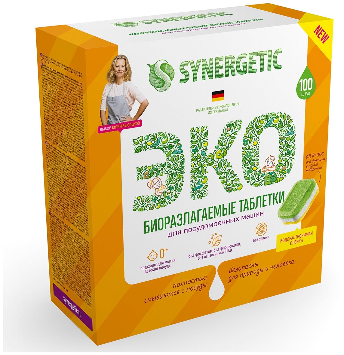 Экологичные таблетки для мытья посуды в посудомоечной машине SYNERGETIC. Полностью смывается с посуды и биоразлагается в воде, а значит не вредит микрофлоре септических установок.