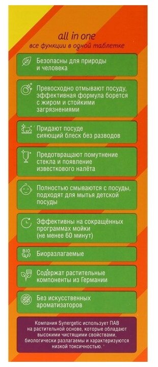 - 7 Если у вас жесткая вода, рекомендуем использовать в комплексе с солью и ополаскивателем SYNERGETIC для максимального результата.