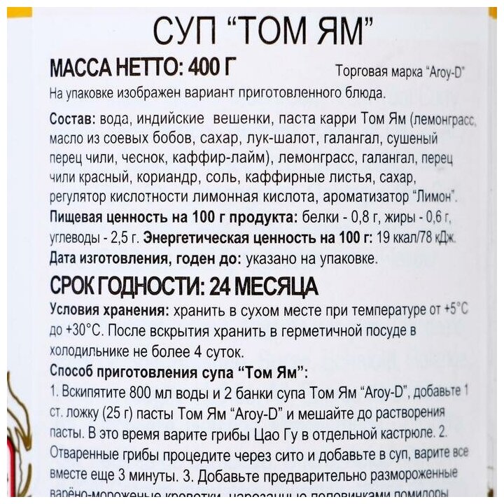 | Состав | вода 71%, индийские вешенки 13%, паста карри том ям (лемонграсc, масло из соевых бобов, сахар, лук шалот, галангал, сушеный перец чили, чеснок, кафир-лайм) 5%, лемонграсc 2,5%, галангал 2,5%, соль 1,78%, кориандр 1,5%, перец чили красный 1,5%, каффирные листья 0,5%, сахар 0,5%, регулятор кислотности лимонная кислота 0,2%, ароматизатор "лимон". |
