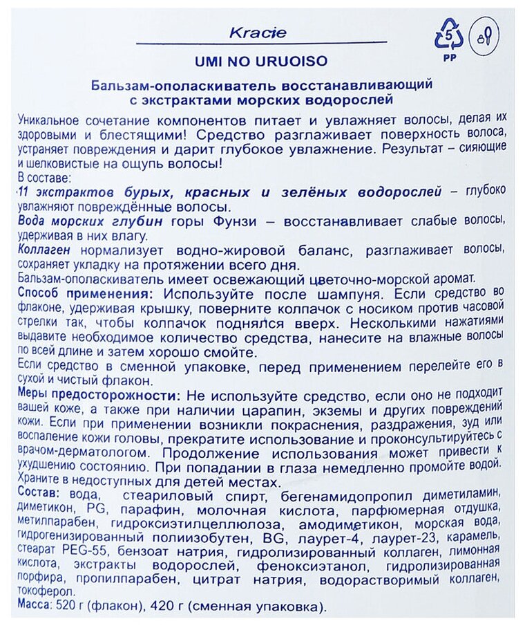 Бальзам-ополаскиватель Kracie Umi No Uruoisi восстанавливающий с экстрактом морских водорослей 520мл