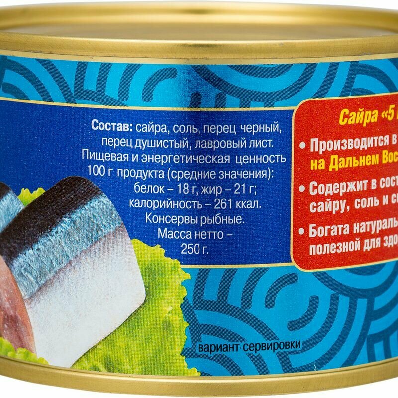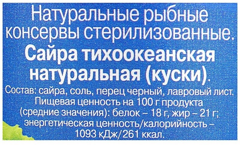 | Состав | Сайра тихоокеанская, соль поваренная пищевая, перец черный, перец душистый, лавровый лист. |