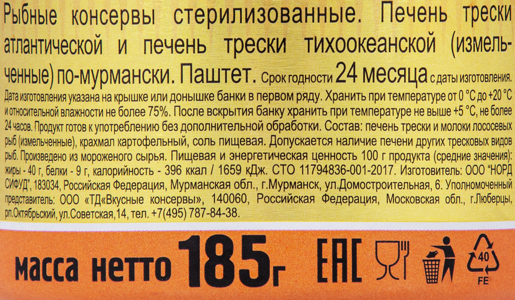 | Состав | Печень трески и молоки лососевых рыб (измельченные в паштет), соль пищевая, специи. |
