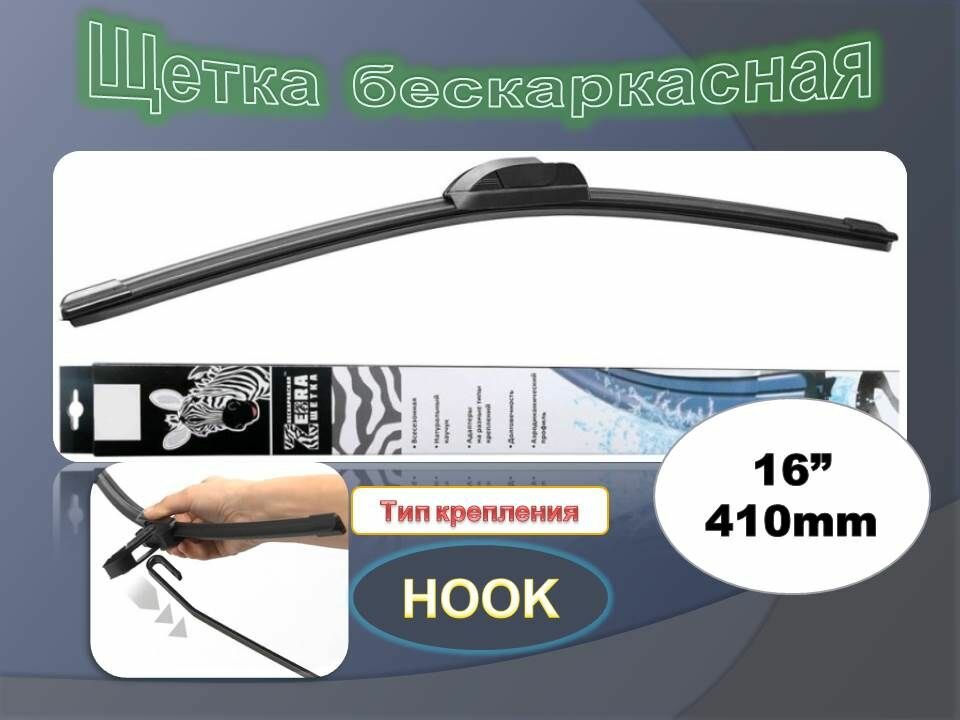 - Тип щетки: бескаркасная, длина: 410 мм, тип крепления: HOOK (крючок)