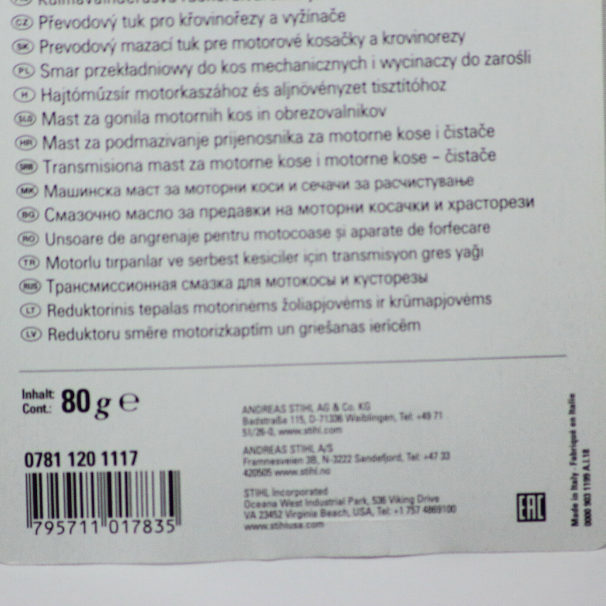 Трансмиссионная смазка STIHL для редуктора. Благодаря входящим в состав компонентам, снижает износ основных частей и повышает устойчивость к коррозии.Преимущества Высокая проникающая способность при одновременно высокой адгезии (даже в компактных передаточных механизмах смазка попадает на все нужные точки) Устойчива к высоким температурам и срезывающим силам Устойчива к окислению