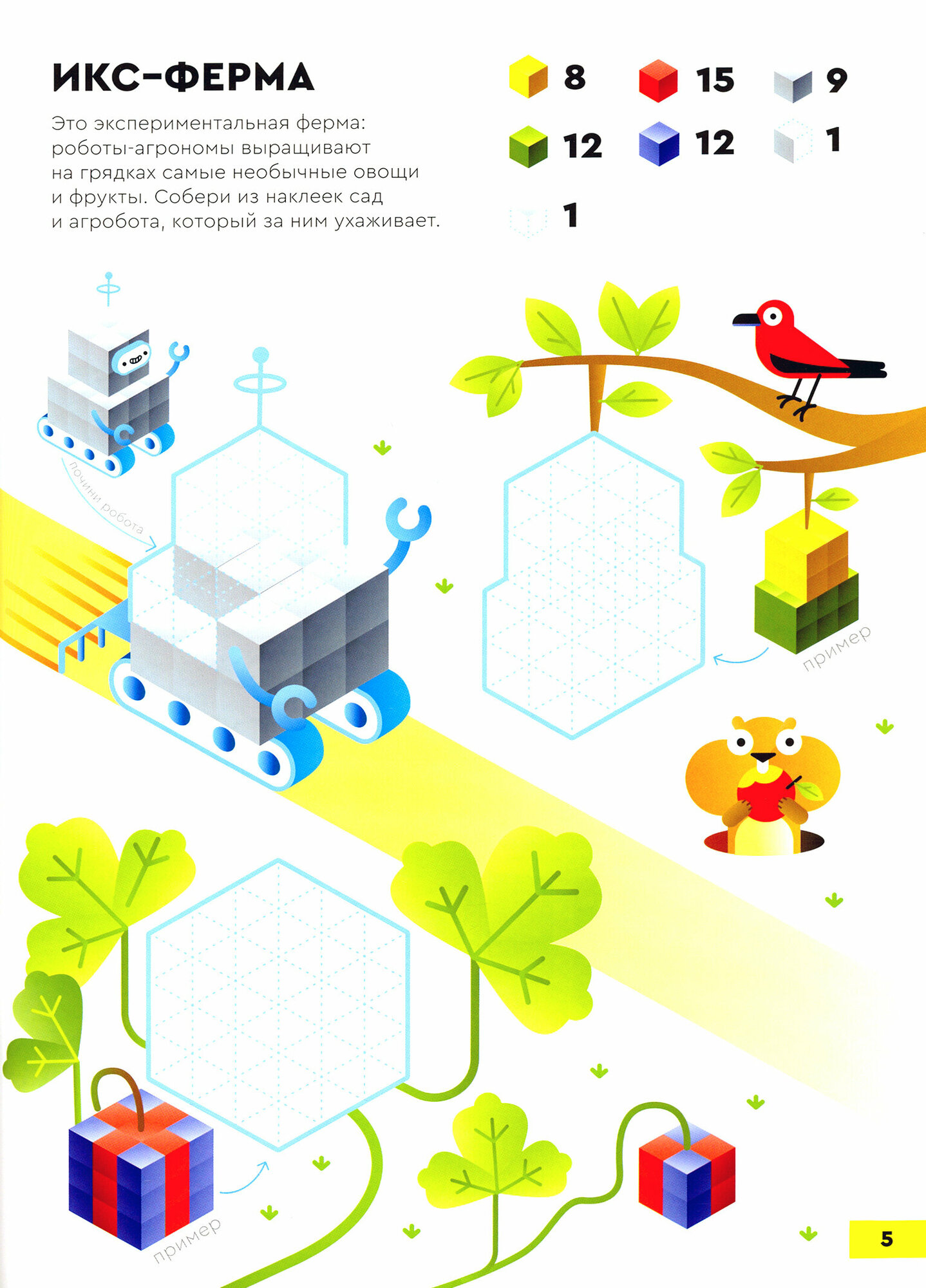 Обратите внимание, рядом с каждым заданием указан тип и количество деталей, которые нужны для его выполнения. Задания лучше решать, придерживаясь этих рекомендаций: так ребёнок научится использовать все типы наклеек разными способами, а деталей точно хватит на все задания.