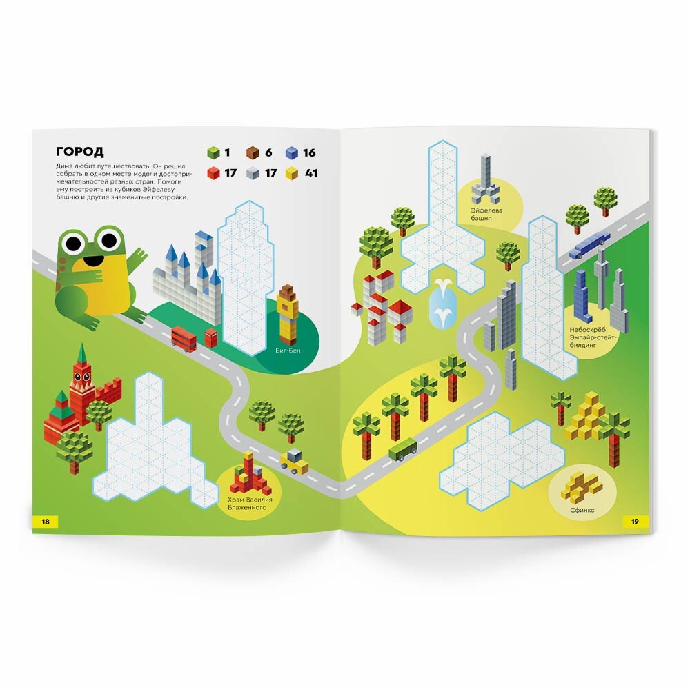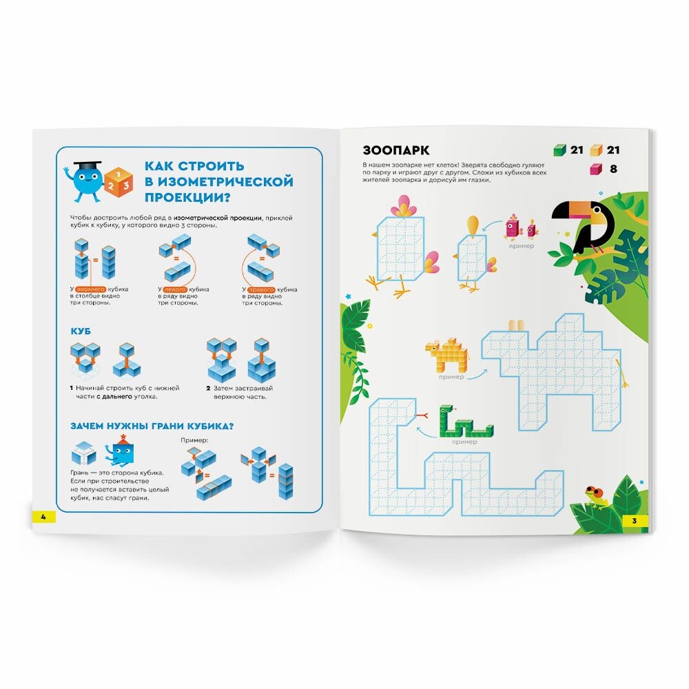 В "Кубометрии 3D" дети строят из кубиков, но не из обычных, а нарисованных. Работая с тетрадью, они разбираются с разными видами проекций кубиков и развивают трёхмерное мышление - способность "вращать" предметы в своей голове и представлять, как они выглядят с разных сторон. В тетради 24 страницы с заданиями и 8 листов с наклейками.