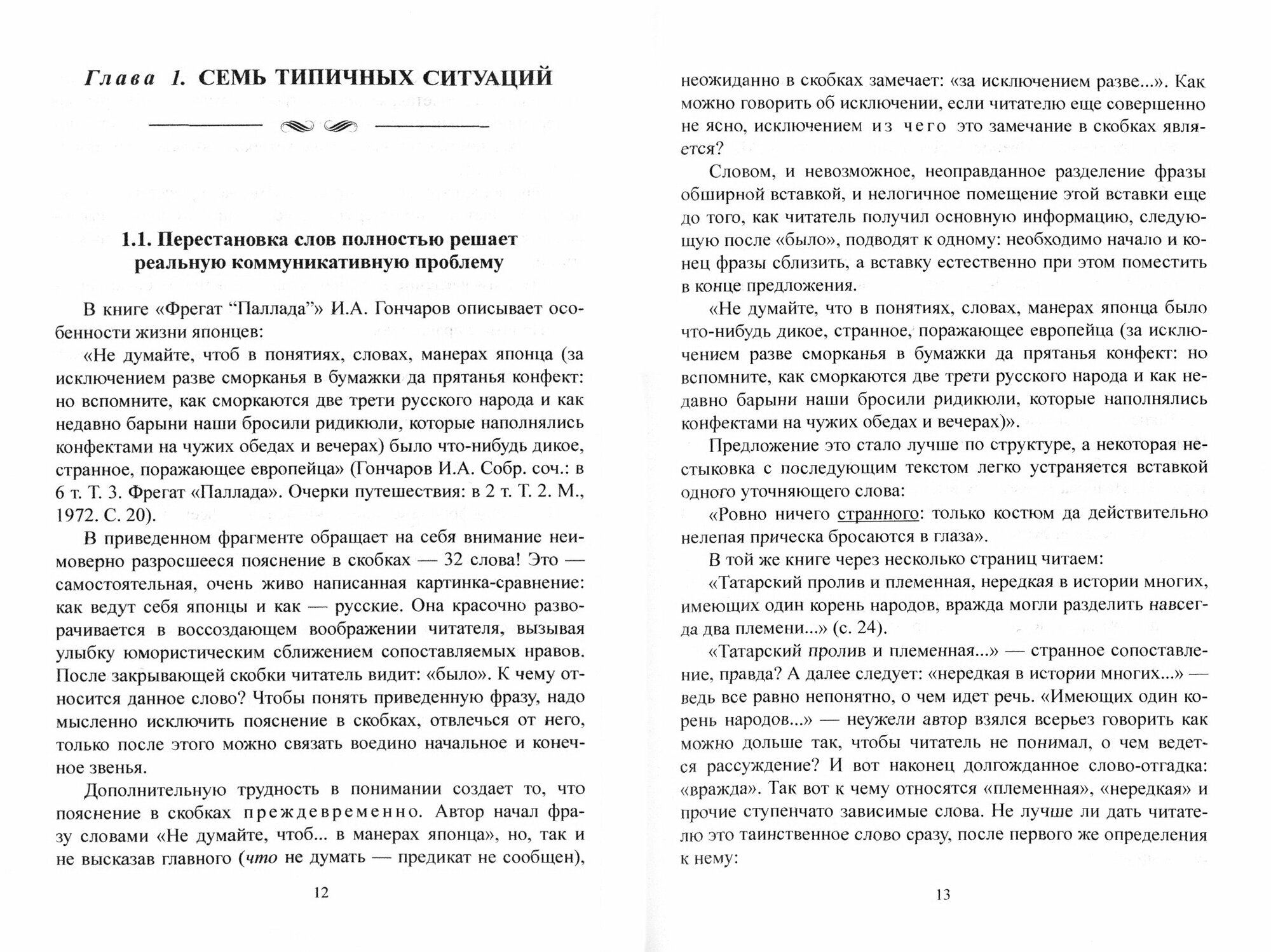 Пособие редакторам и писателям в помощь. Даёт понимание, что неудачный порядок слов может быть исправлен не только простой перестановкой, но и несколькими альтернативными способами. Для меня полезным оказалось понимание, что перестановка иногда вообще не самый подходящий вариант, так как, например, делает фразу неестественно звучащей, а иногда и вовсе невозможна. Ещё пособие учит перед редактированием классифицировать ошибки, что поможет точнее подобрать способ исправления (смещённое логическое ударение, ошибочная смысловая связь и др.). В конце книги целая глава отведена тренировочным упражнениям, сгрупированным по типам ошибок.