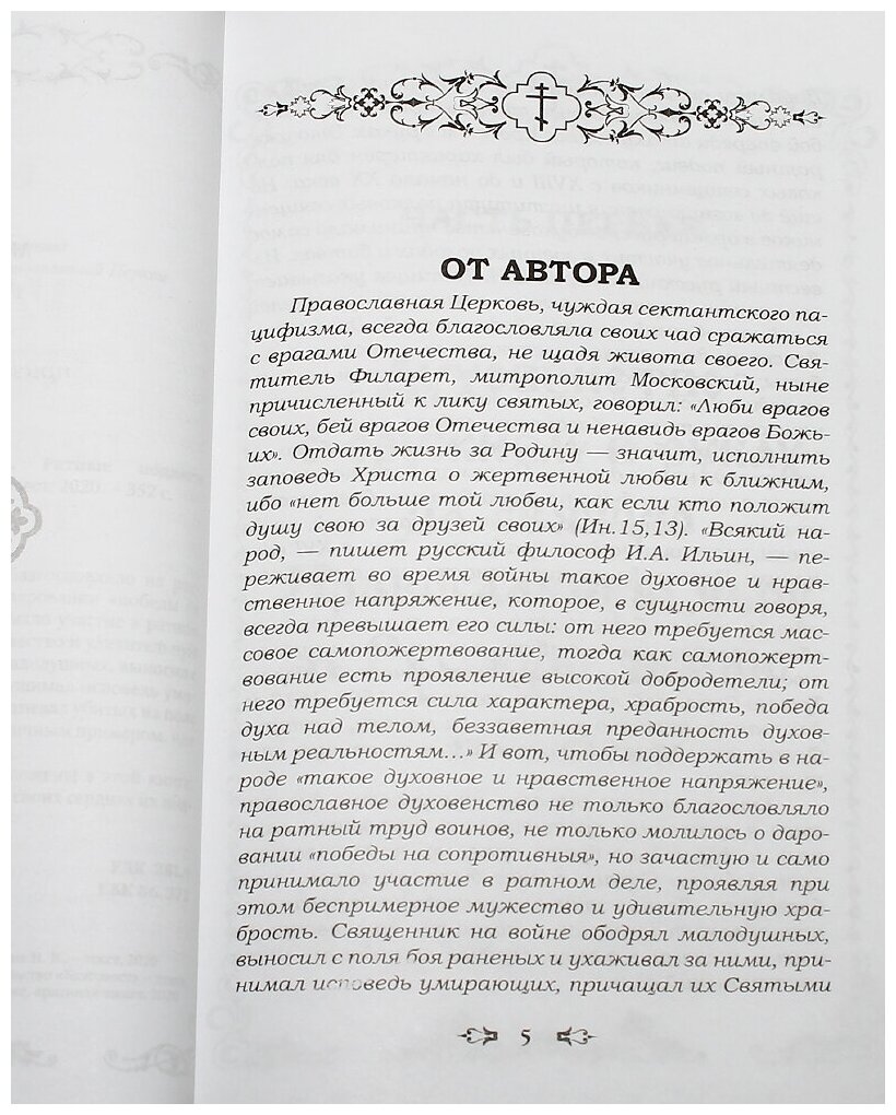 Православное духовенство не только благословляло на ратный труд воинов, не только молилось о даровании "победы на сопротивныя", но зачастую и само принимало участие в ратном деле, проявляя при этом беспримерное мужество и удивительную храбрость. Священник на войне ободрял малодушных, выносил с поля боя раненных и ухаживал за ними, принимал исповедь умирающих, причащал их Святыми Дарами и отпевал убитых на поле брани. А еще он вдохновлял солдат своим личным примером, идя в бой впереди атакующих с Крестом в руках.