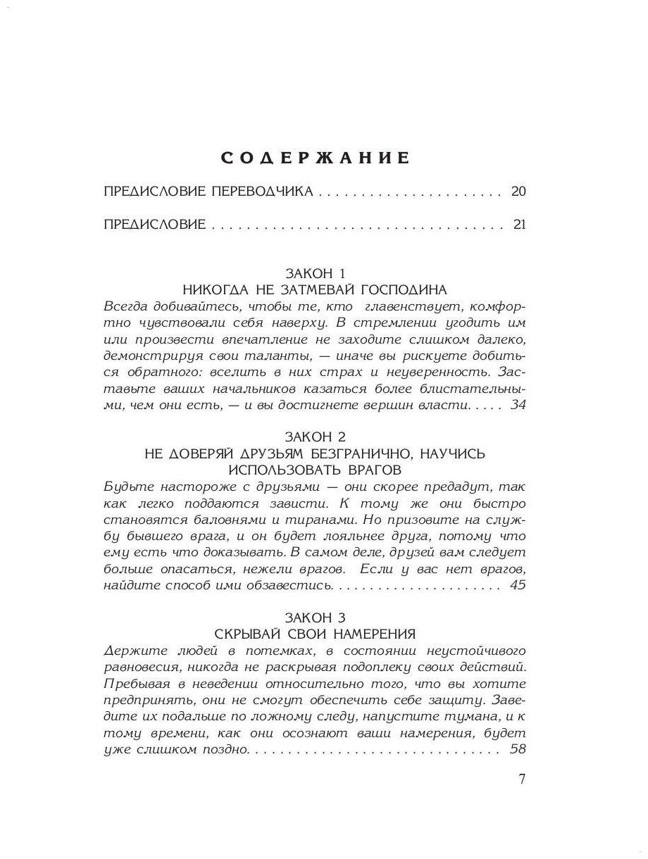 Книга представляет собой советы (законы) по обладанию властью и по тому, как надо и не надо делать, чтобы добиться успеха в этом. Самый большой плюс книги в том, что каждый закон сопровождается примером из истории. Именно это мне понравилось больше всего, как говорится: история — лучший учитель.